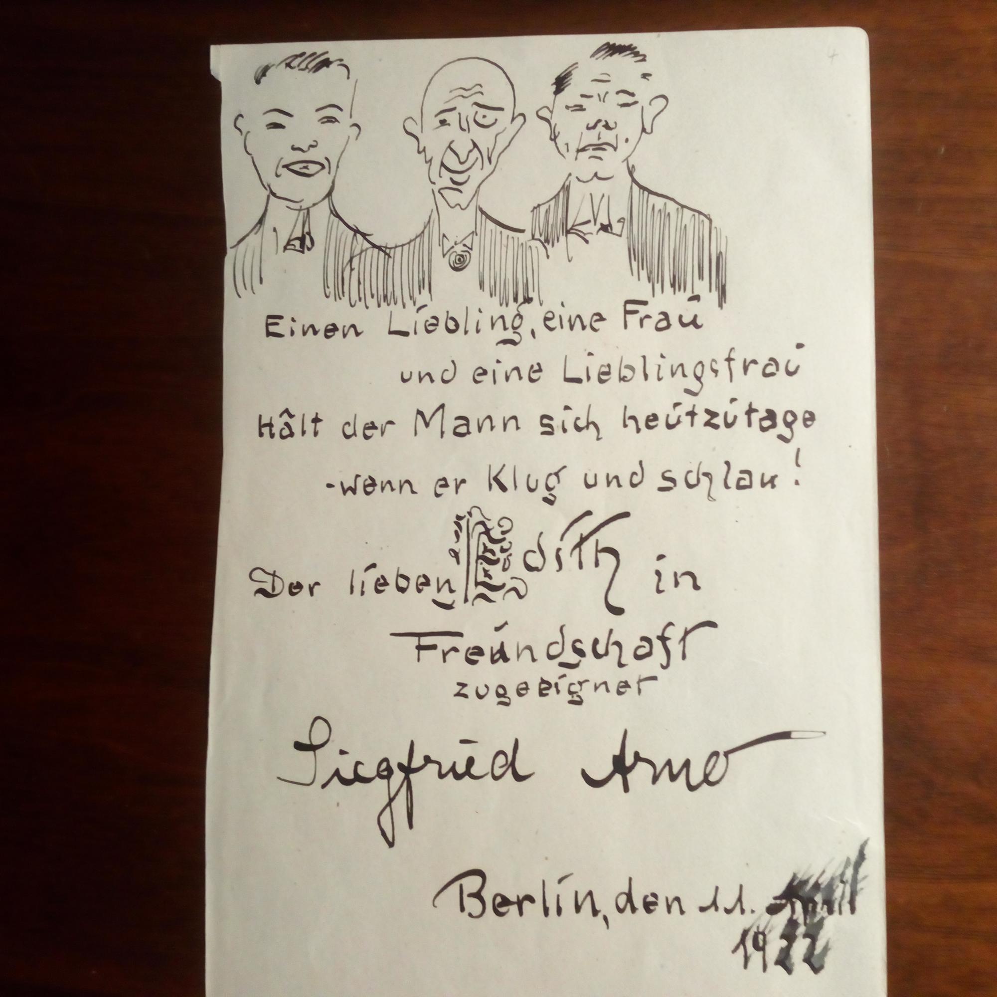 1895-1975, Tänzer, Sänger u. Schauspieler (Komiker)- kl.8°-Albumblatt m. witziger e. Zeichnung, e. Zitat, Widm. (für "Edith") u. U., Berlin 11.4.1922, kl. Wischspur am Ende. "Einen Liebling, eine Frau/ und eine Lieblingsfrau/ hält der Mann sich heutzutage/ -wenn er klug und schlau!".