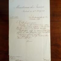 1834-1906, Mediziner und badischer Gesundheits-Politiker - Schreiben m. Br.kopf des Innenministeriums, seine U. als Gegenzeichn., Karlsruhe 11.3.1884, ¾ S. folio, Aktennr., kl. Gebr.spuren. An Amtmann Braun in Pforzheim: "Die Krankenversicherung der Arbeiter betr." (die spätere AOK, im Vorjahr gegründet). Für die "Ausarbeitung verschiedener Entwürfe" bekommt B. "300 M.".