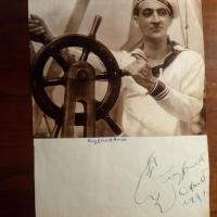 1896-1975, Schauspieler u. Komiker - witzige U. (mit kl. Zeichnung) u. Jahr 1931 (hier kl. Wischspur) unter auf 4° mont. Foto (aus einem Filmprogramm). Rücks. ähnl. Foto m. Widm. u. U., 23.5.1931, von dem Schauspieler u. Kabarettisten Albert Paulig (1873-1933).