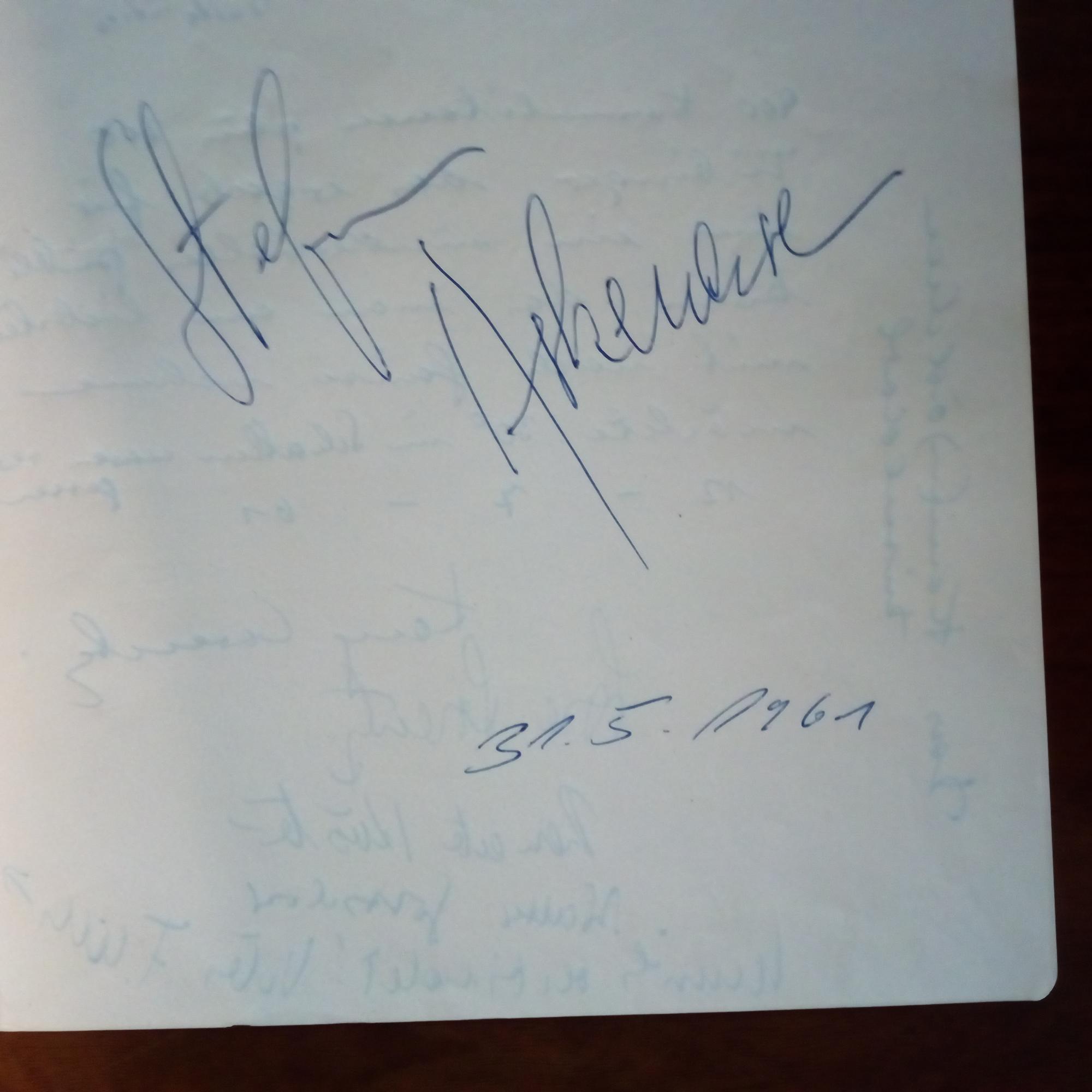 1896-1985, poln.-belg. Pianist - Blatt (kl.4°) mit großer U. und D. 31.5.1961 (Gastspiel bei einer Tübinger Studentenver-bindung). Auf Rücks. Einträge des Schauspielers Günther Lüders, Kay Lorentz (ausführl.) und anderen Mitgliedern der Kabarett-Gruppe "Düsseldorfer Kom(m)ödchen": Lore Lorentz, Renate Küster...