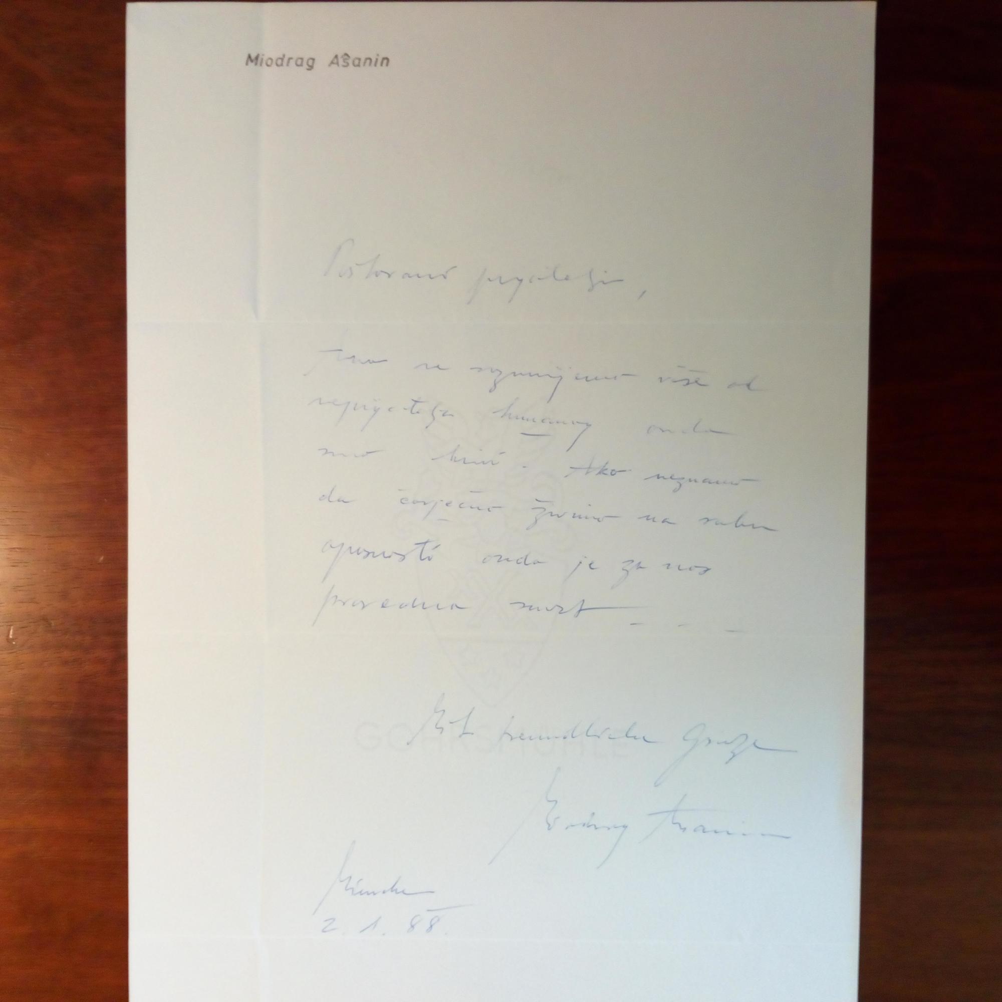 1930-2004, kroat. Journalistin und Schriftstellerin - E. Brief mit U., München 2.1.1988, 1 S. 4°, mit postal. Umschlag. Kroatisch, an einen Sammler.