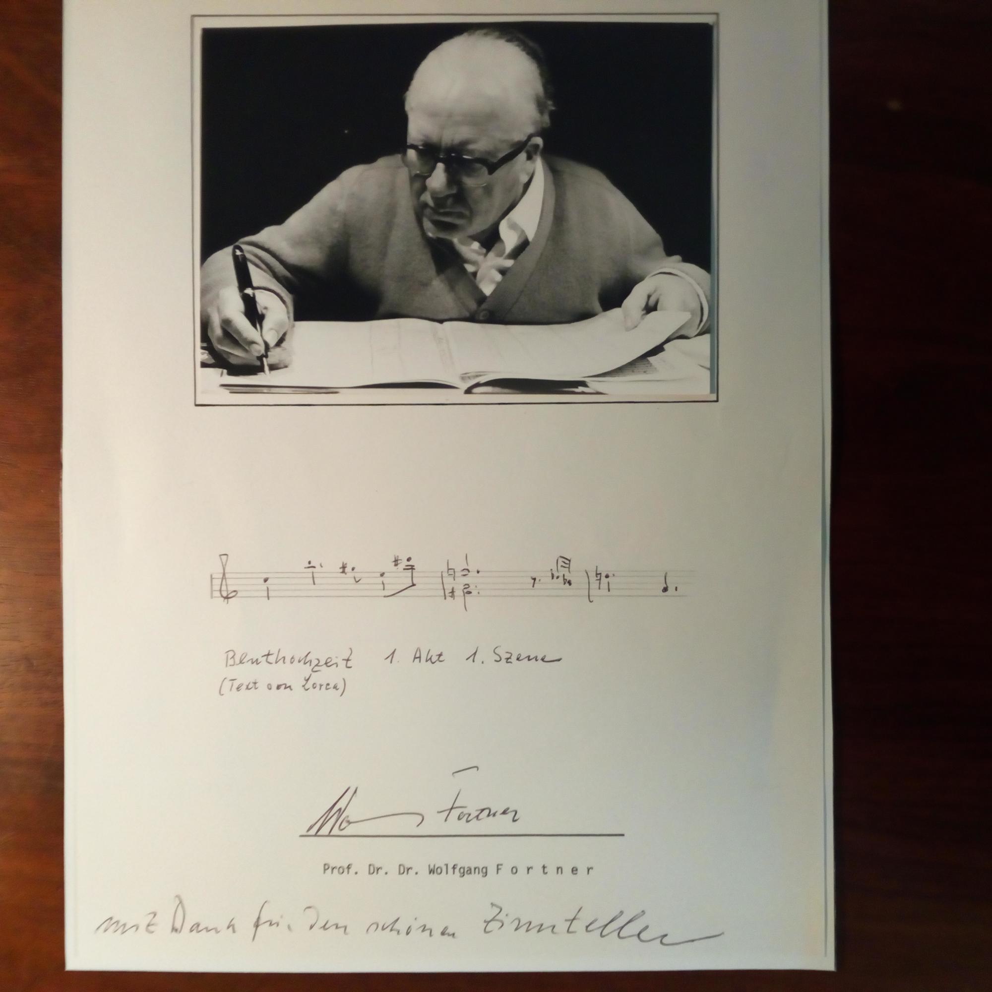 1907-87, Komponist - E. Notenzeile ("Bluthochzeit 1. Akt 1. Szene Text von Lorca", 3 Takte) mit U. und e. Mitt. unter auf 4° mont. Hochglanz-Pfo. (beim Komponieren).