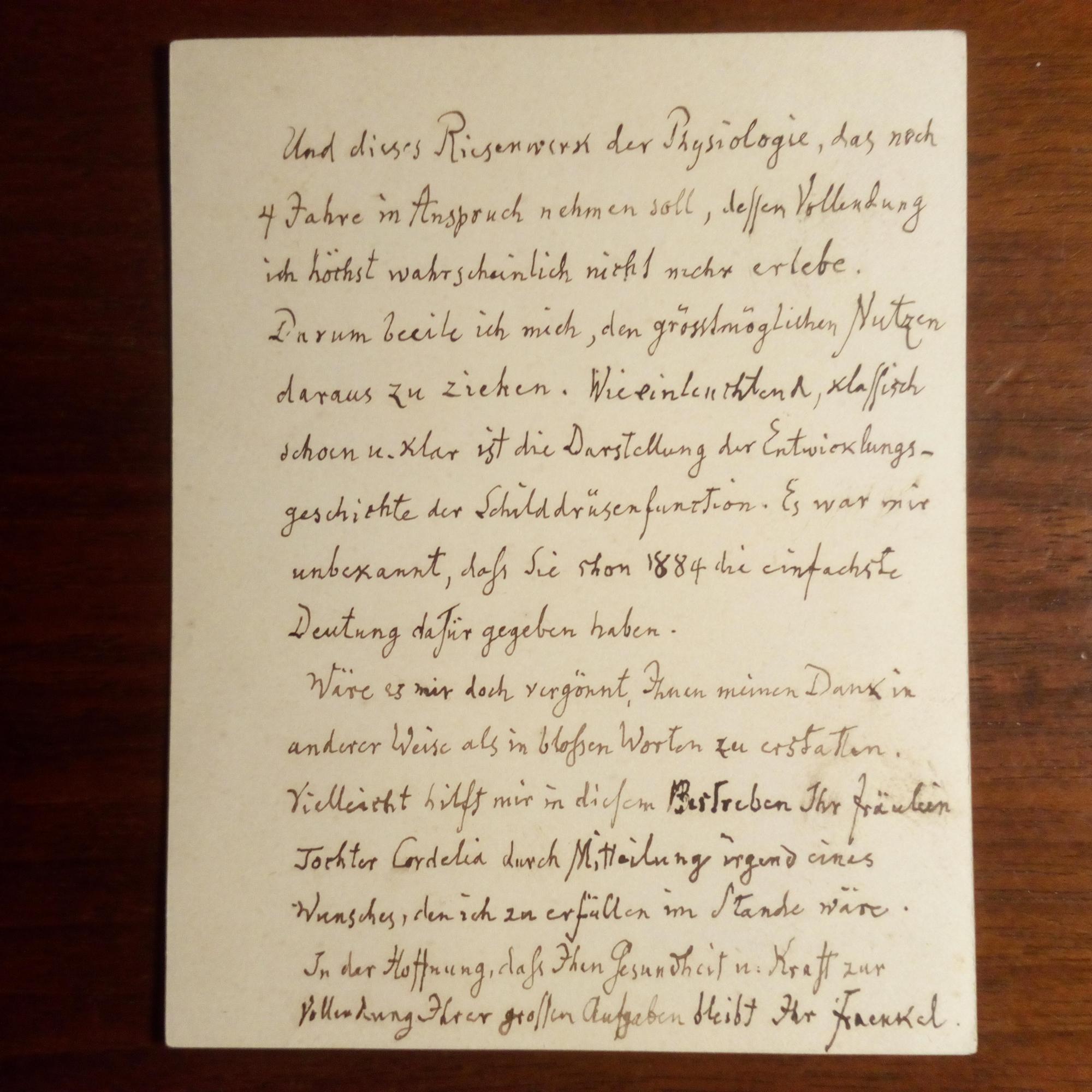 1848-1916, Internist und Bakteriologe - E. Briefkarte mit U., Dessau 12.1.1900, 2 S., kl. Schrift, mit e. postal. Umschlag (Marke ausgerissen). An den Kollegen Luigi Luciani (1840-1919) in Rom. Dankt für dessen "Fisologia", die er dem Werk Virchows gleichstellt.