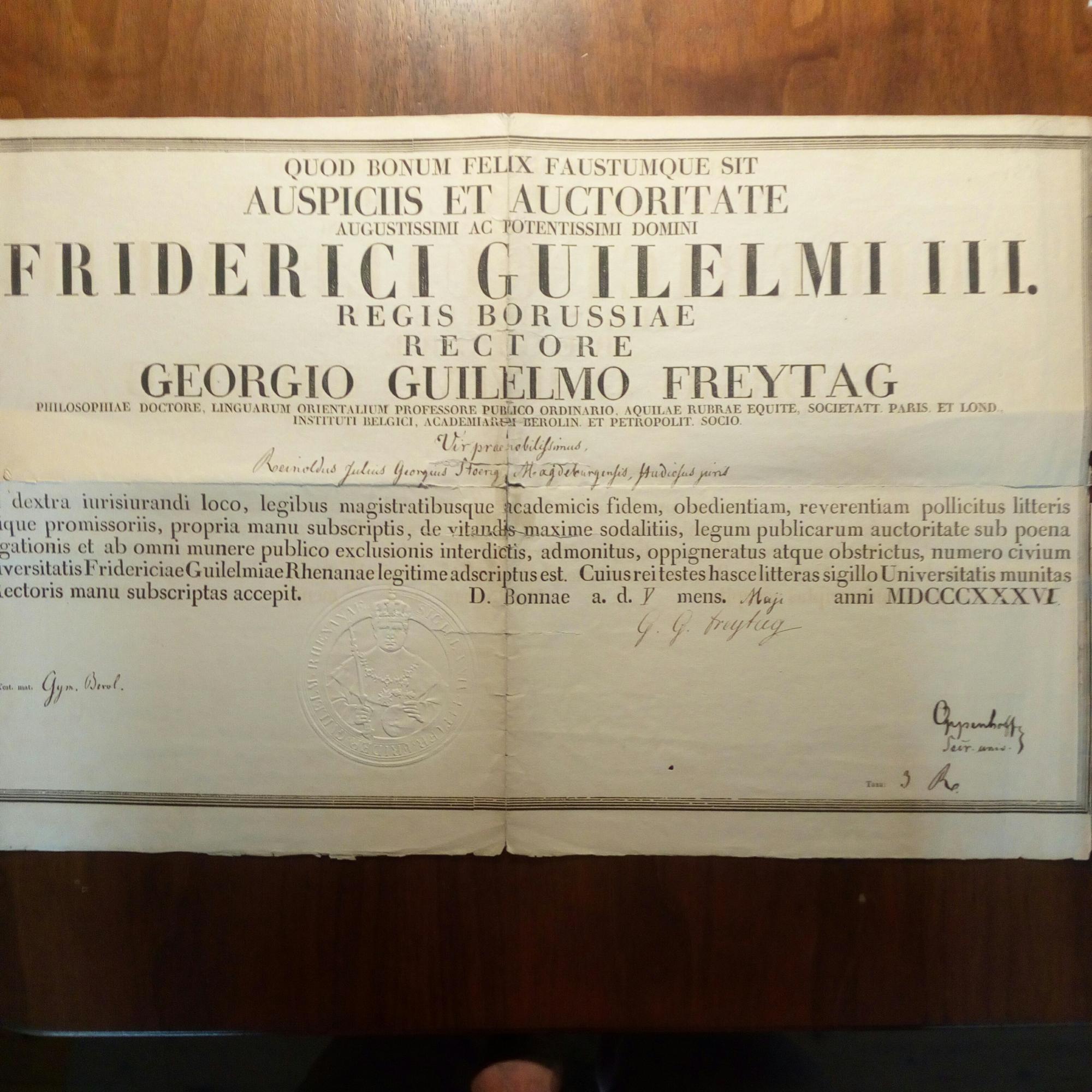 1788-1861, Orientalist in Bonn - Große Entlassungsurkunde der Universität Bonn (ca. 2 x quer folio) mit U. "G.G. (Guilhelmus) Freytag" 5.5.1836, lateinisch, für den Jura-Studenten Reinhold Störig aus Magdeburg, gepr. Siegel, ger. Altersspuren.