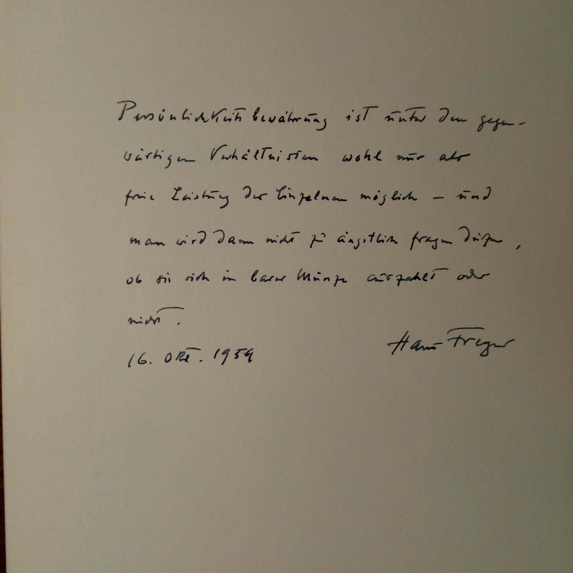 1887-1969, Soziologe - 8°-Blatt m. e. Zitat, U. u. D. 16.10.1959. "Persönlichkeitsentwicklung ist...". Auf Rückseite ähnliche Einträge von dem Schriftsteller Manfred Hausmann (1898-1986) und dem evangel. Theologen Wilhelm Mensching (1887-1964).