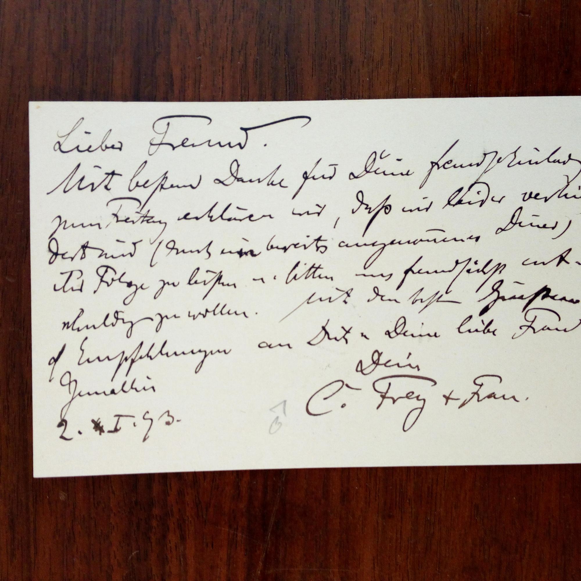 1857-1917, Kunsthistoriker - E. postal. Postkarte m. U., (Berlin) 2.1.1893. Sagt dem Freund, Dr. R. Königer in Charlottenburg einer Einladung ab: ...erklären wir, dass wir leider verhindert sind...