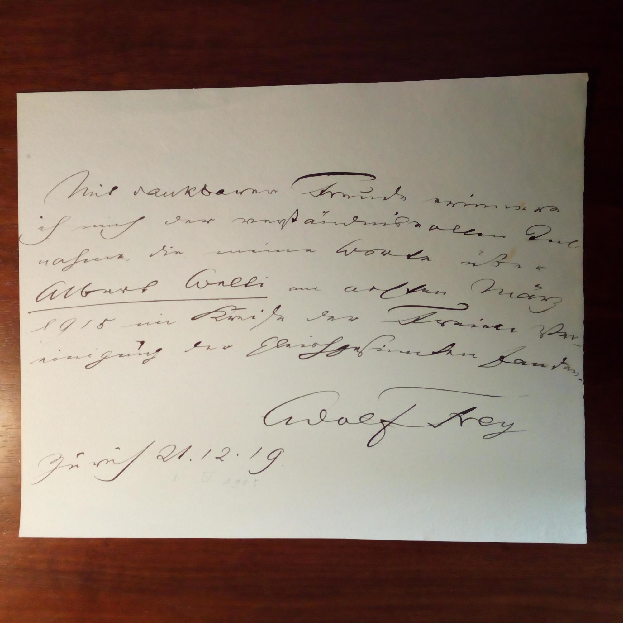 1855-1920, schweiz. Schriftsteller - 4°quer-Blatt mit aus-führl. Widm. und U., Zürich 21.12.1919. Anlässl. seines Vortrages über den Schriftst. Albert Welti in der "Freien Vereinigung der Gleichgesinnten".