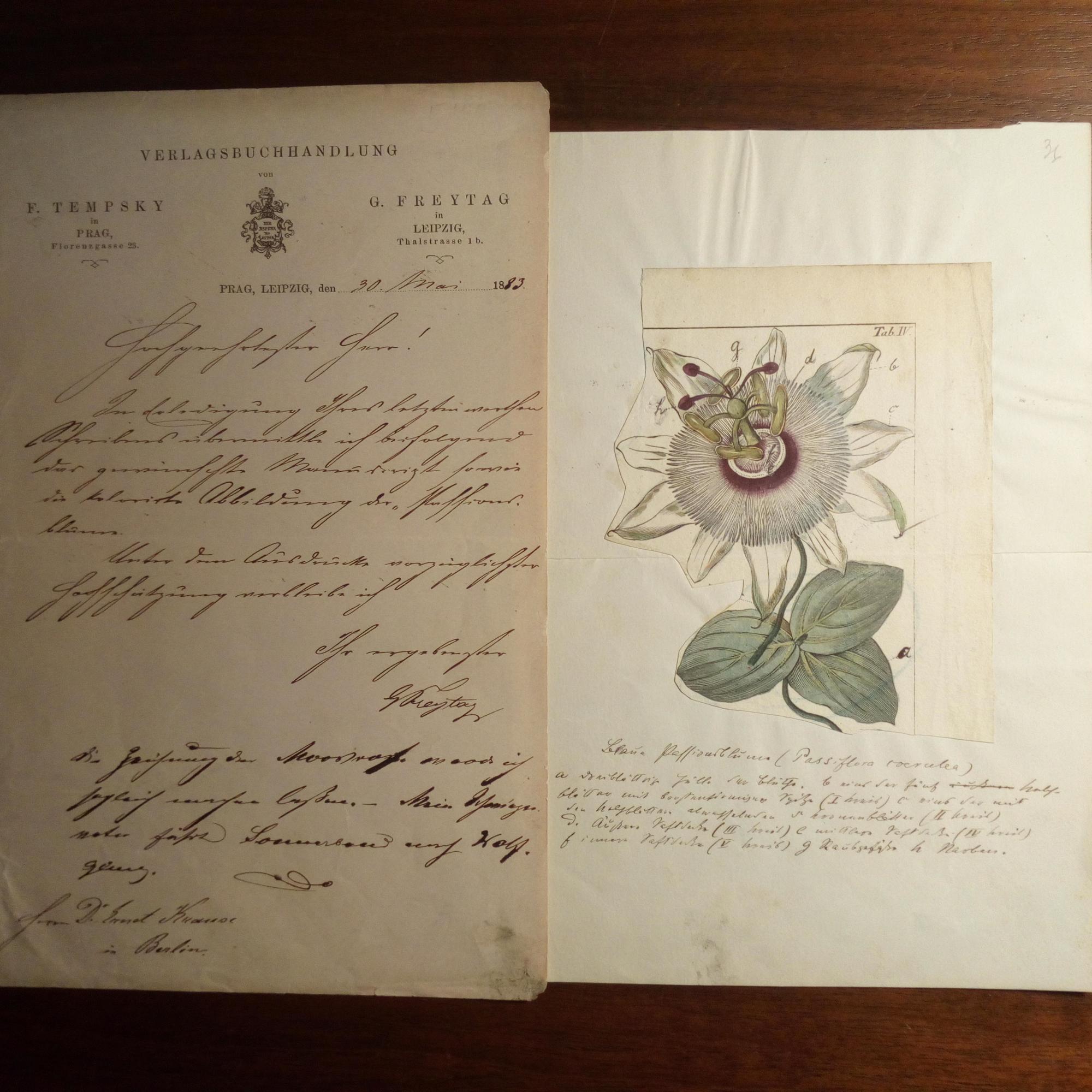 geb. 1853, Verleger (Tempsky & Fr.) - E. Begleitbrief mit U., (Leipzig) 30.5.1883, an den Biologen Ernst Krause (1839-1903) in Berlin zur "kolorirten Abbildung der Passionsblume" (Fragment aus einem wissensch. Werk, liegt bei), 1 S. 8°, Br.kopf des Verlages, kl. Gebr.spuren. Will eine Zeichnung ("Moorgras") anfertigen lassen und zu einer Reise seines Schwiegervaters, des Verlagsgründers Friedrich Tempsky.