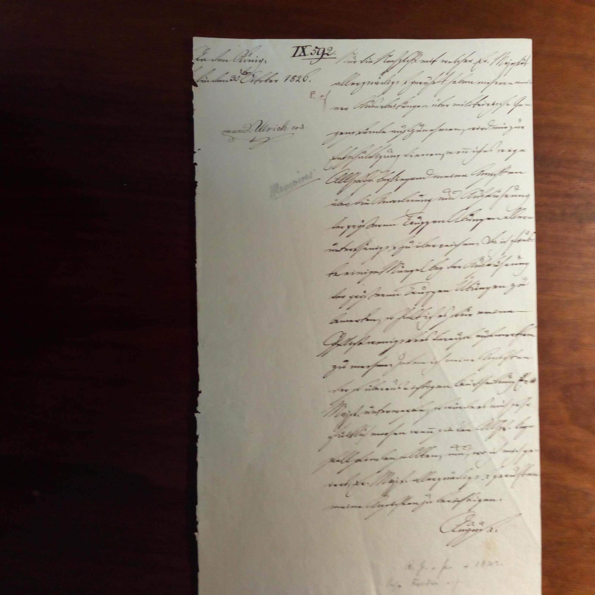 1779-1843, Prinz (Neffe von Friedrich II.), General, Chef der Artillerie - E. Brief mit U., München 30.10.1826, 1 S. folio, Adr.seite fehlt und kl. Gebr.spuren, Archiv-Vermerke. An den König (Friedrich Wilhelm III.): Details zur "Berechnung der größeren Truppen- Übungen": ...einige Mängel bey der Ausführung... Beiliegt schöner e. Briefschluss (Fragment) mit U., Berlin 23.9.1830.