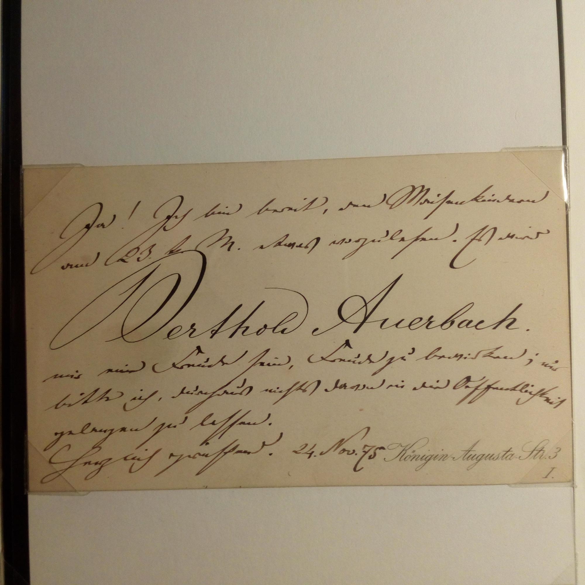 1812-82, Schriftsteller - 8°-Blatt mit e. Zitat, U., Dresden 3.11.1856, gepr. Initialen am Kopf, ger. fleckig. "Die ewigen Sterne erglühen über der niedersten Hütte. (Barf. S.142)" (aus seiner in diesem Jahr ersch. Dorf-Erzählung "Barfüßele"). Beiliegt Karte mit gr. Faksimile-U., darauf e. Schreiben mit D. 24.11.1875: ...bin bereit, den Waisenkindern...vorzulesen...bitte...nichts an die Oeffentlichkeit gelangen zu lassen...