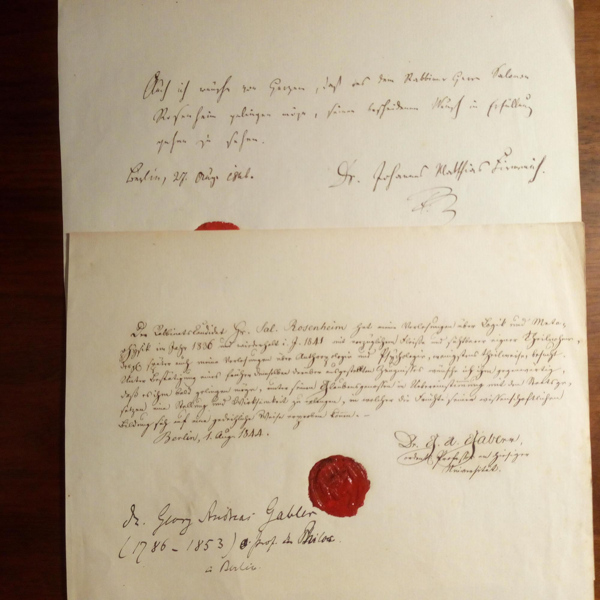 1786-1853, Philosoph, Nachfolger Hegels in Berlin - Zeugnis für erfolgreichen Besuch seiner "Vorlesungen über Logik und Metaphysik" für "RabbinatsCandidaten" Salomon Rosenheim, Berlin 1.8.1844, Lacksiegel: ...daß es ihm bald gelingen möge, unter seinen Glaubensgenossen...eine Stellung und Wirksamkeit zu erlangen... Beiliegt Empf.schreiben mit U. für dens. des Germanisten Johannes Matthias Firmenich (1808-89).