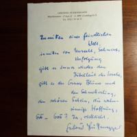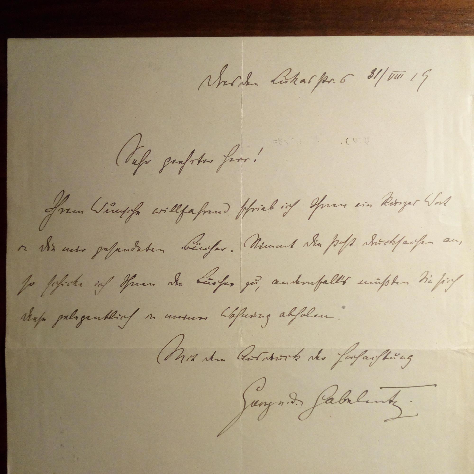 1882-1947, Schriftsteller - 2 e. Briefe mit U., Berlin 1913/14, je 4 S. 8°, mit e. postal. Umschlägen. An den Nationalökonomen Friedrich Lenz in Braunschweig mit literaturwiss. Erörterungen. Beiliegen: Brief mit U.., Geigenberg 27.10.1940, 5 S. 4°, gel., mit ähnl. Inhalten (teilw. antisemitisch). Und Brief mit U., Gotha Dreikönig 1927, 1 S. kl. 4°. "Dichtergruß" an die "Herren von Dornbusch" (in Wien): ...Im Frühling geht?s nach dem Wiener Wald, dort in der Heimatluft wird vielleicht der Genius wieder roglig, hier in Thüringen, wo die Leut nicht einmal einen Kruselspitz von einem ausgezogenen Apfelstrudel unterscheiden können, kriegt man als Österreicher die Gall- und die Schlafsucht.