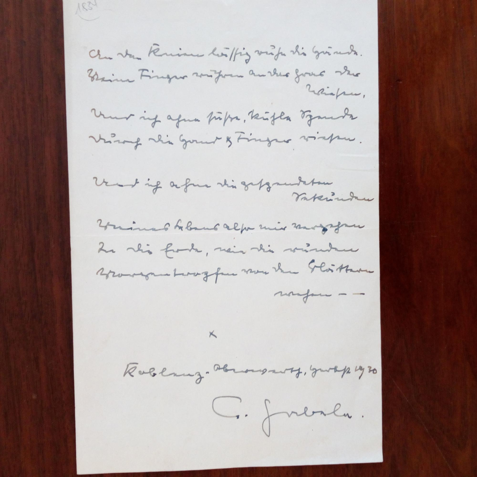 1890-1966, Schriftsteller - E. Gedicht (2 Str. à 4 Z.) mit U., Koblenz Herbst 1930, 1 S. 8°. "An dem Kamine lässig ruhen die Hände./ Deine Finger rühren an das Gras der Wiesen/... Ger. Gebr.spuren.