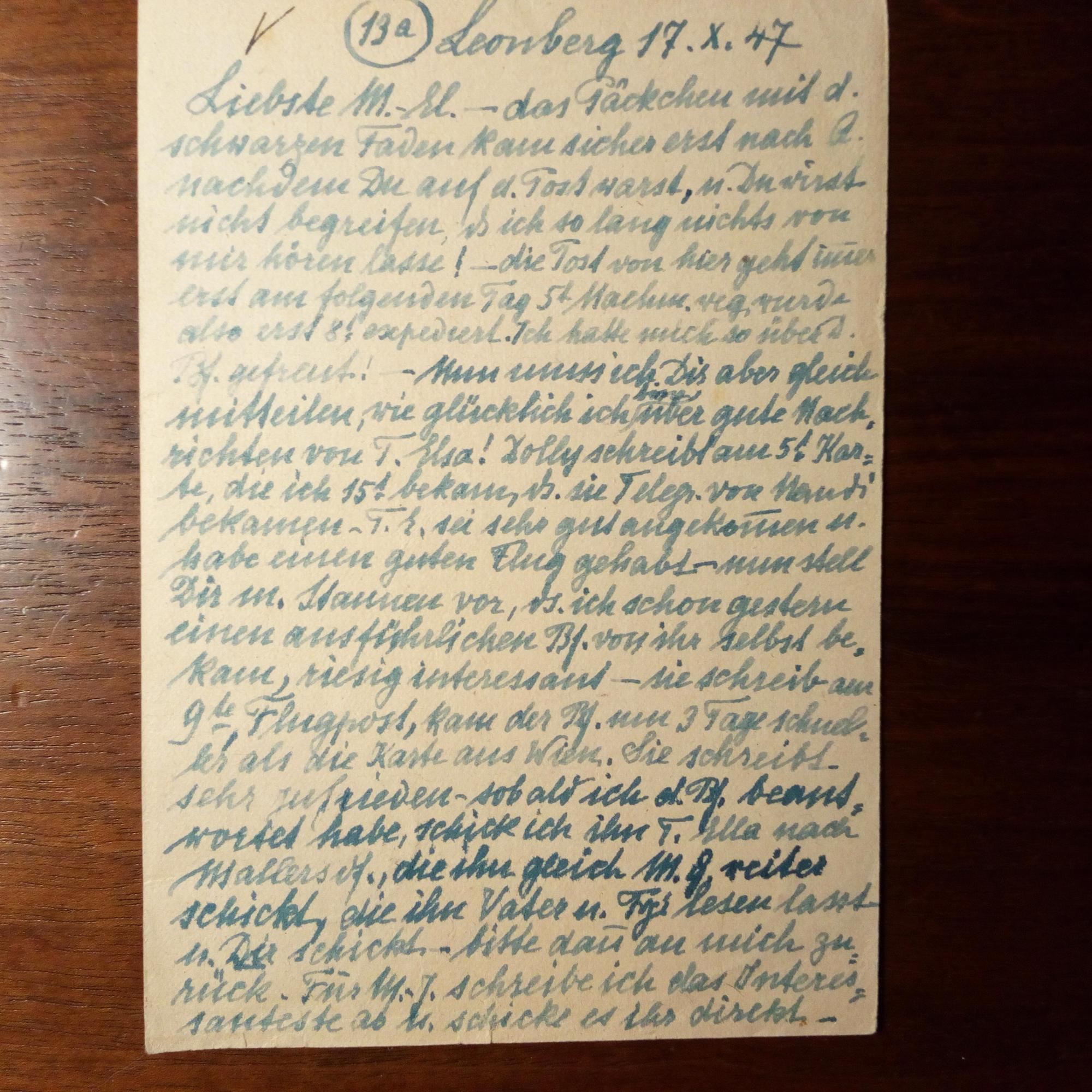 geb. Hohenlohe-Waldenburg-Schillingsfürst, 1868-1952, Fürstin - E. postal. Postkarte ohne U., Schloss Leonberg (Oberpfalz) 17.10.1947, sehr kl. und dicht geschr., Abs.stempel. An "Frau M.-Kl. Waka", geb. Gräfin von Deym in Arnstorf (Niederbayern) betr. eines "Päckchens mit schwarzen Fäden" und über Verwandte und Freunde.