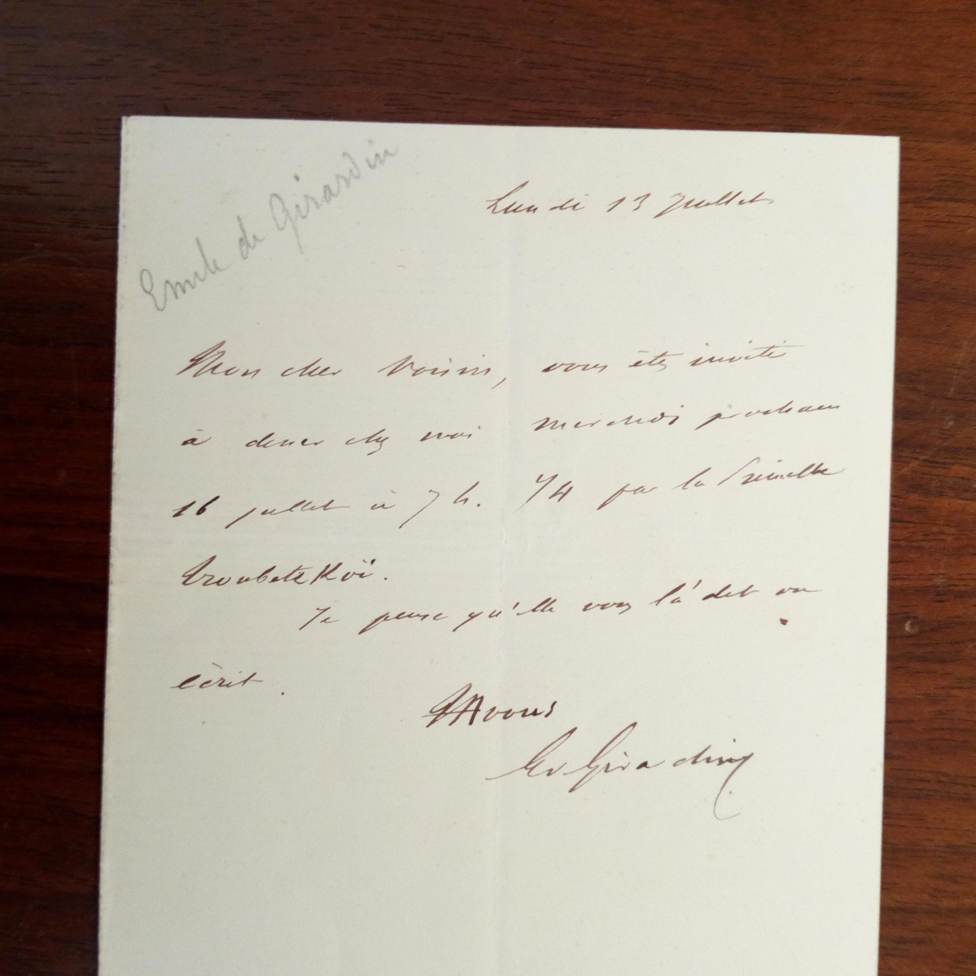 1806-81, frz. Journalist und Publizist - E. Billet m. U., ¾ S. kl. 8°. Lädt den Ingenieur Voisin Bay (1821-1918, Mitkon-strukteur des Suez-Kanals) zum Diner ein.