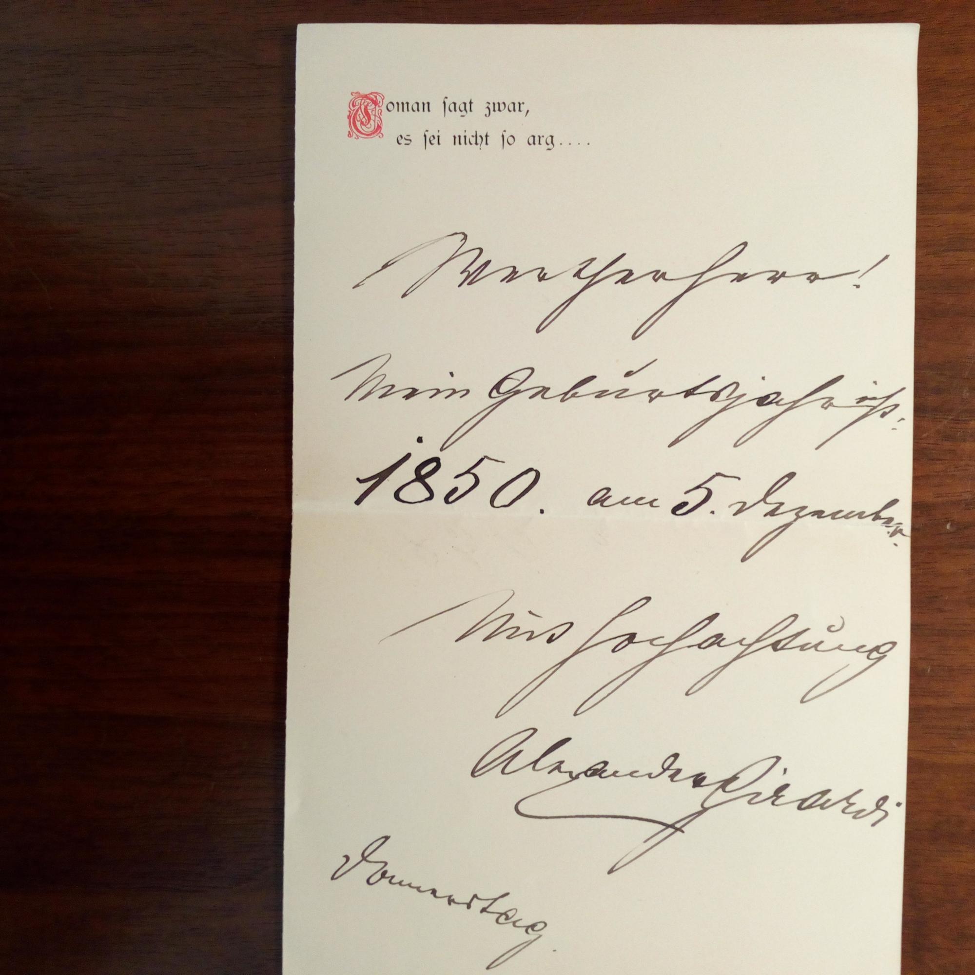 1850-1918, Schauspieler - E. Kurzbr. m. U., 1 S. 8°, große Schrift, gedr. Zitat am Kopf. Dieses auch als Abs. auf e. postal. Umschlag (Wien 14.4.1893) an "Bezirksrichter Eltz" in Hainburg: ...Mein Geburtsjahr ist 1850. am 5. Dezember...