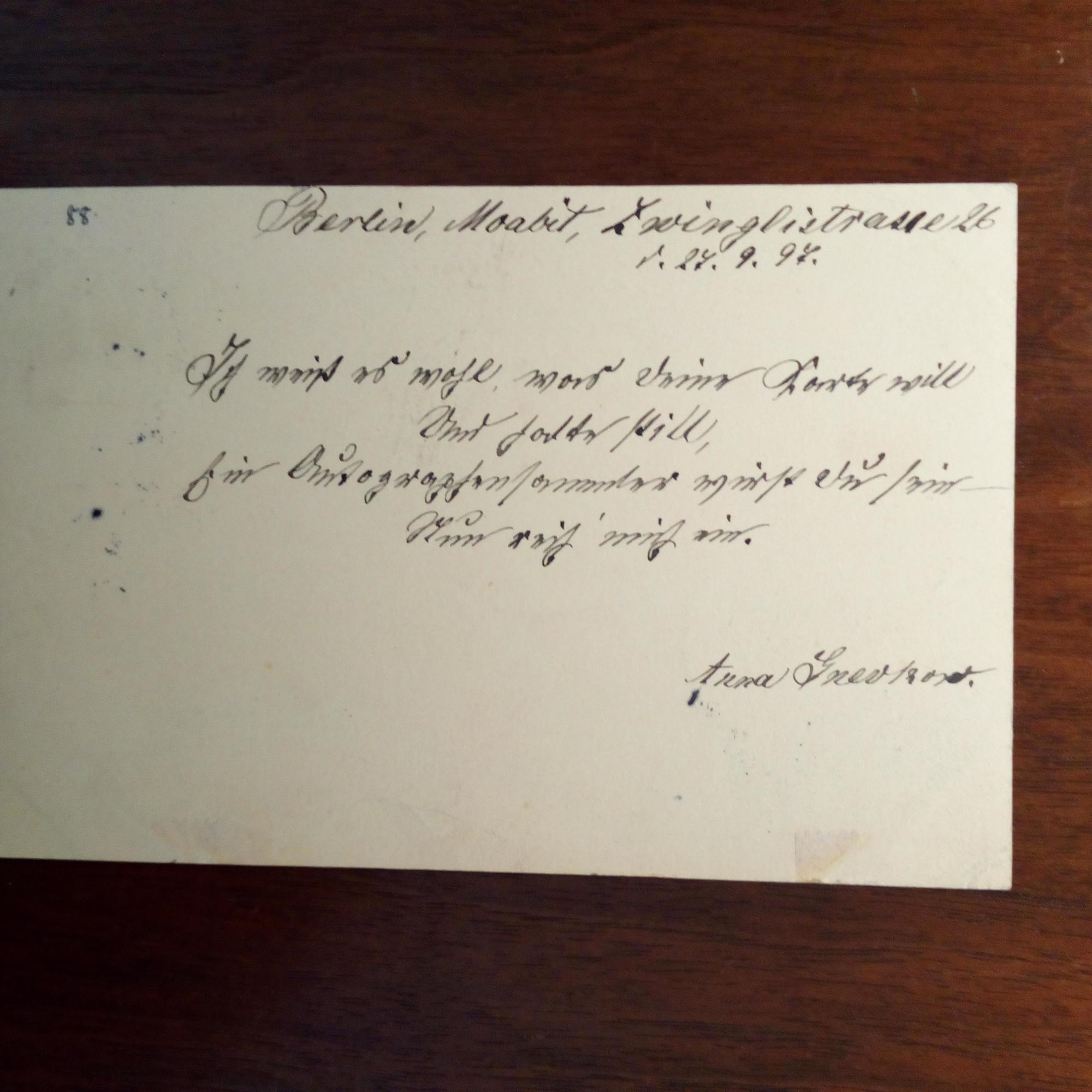 1846-1931, Schriftstellerin - E. postal. Postk. mit U., Berlin 27.9.1897, kl. Gebr.spuren. "Ich weiß es wohl, wer Deine Worte will/ Und halte still,/ Ein Autographensammler wirst Du sein-/ Nun reih' mich ein.".