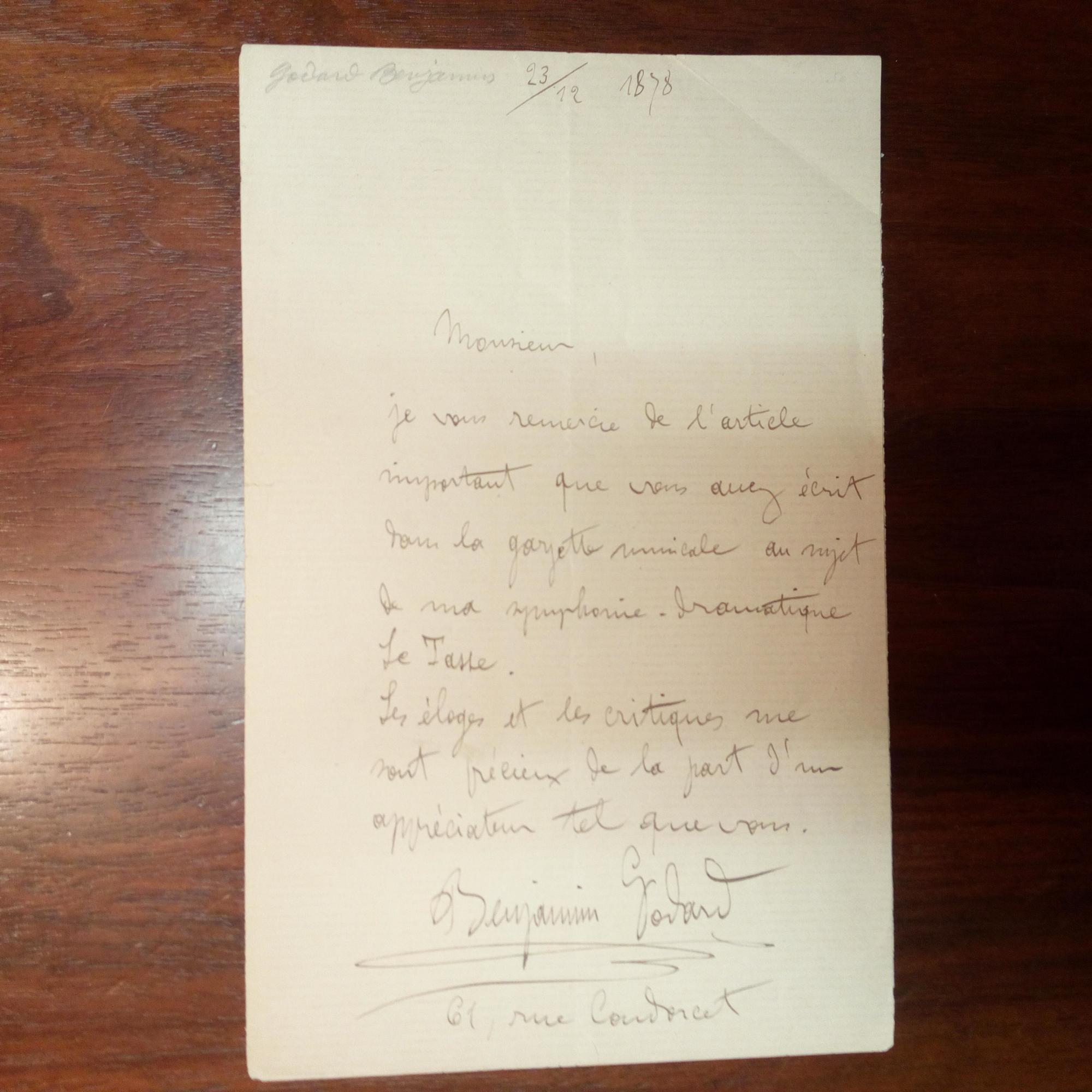 1849-95, frz. Komponist - E. Brief mit U., (Paris) 12.12.1878, 1 S. 8°. An den Kritiker Adolphe Julien (1845-1932): ...je vous remercie de l'article important que vous avez écrit dans la gazette musicale au sujet de ma symphonie dramatique Le Tasso...