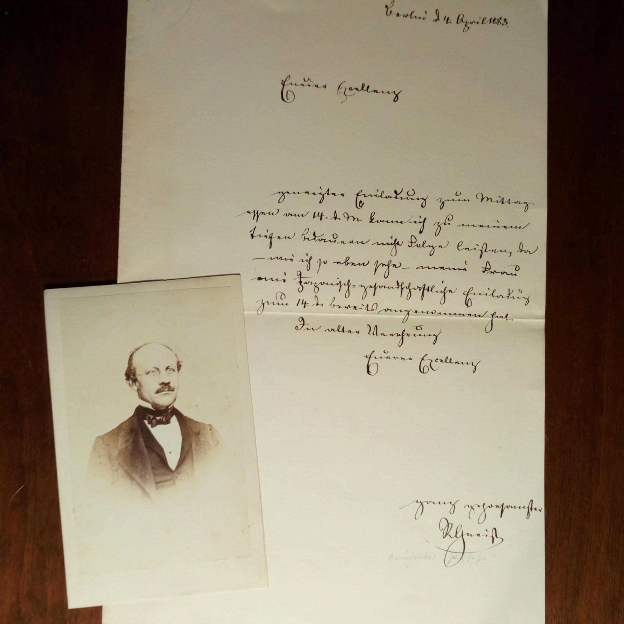1816-95, preuß. Jurist und Politiker - Schöner e. Brief mit U., Berlin 4.3.1883, ¾ S. 8°. Muss Justizminister Heinrich von Friedberg (1813-95) die Einladung zu einem Mittagessen absagen, ...da... meine Frau einer Zazaisch (Bevölkerungsgruppe in Ost-Anatolien) gesandtschaftliche Einladung...bereits angenommen hat... Beiliegt kl. Pfo. (Hoffotografen Lutze & Witte, Berlin).