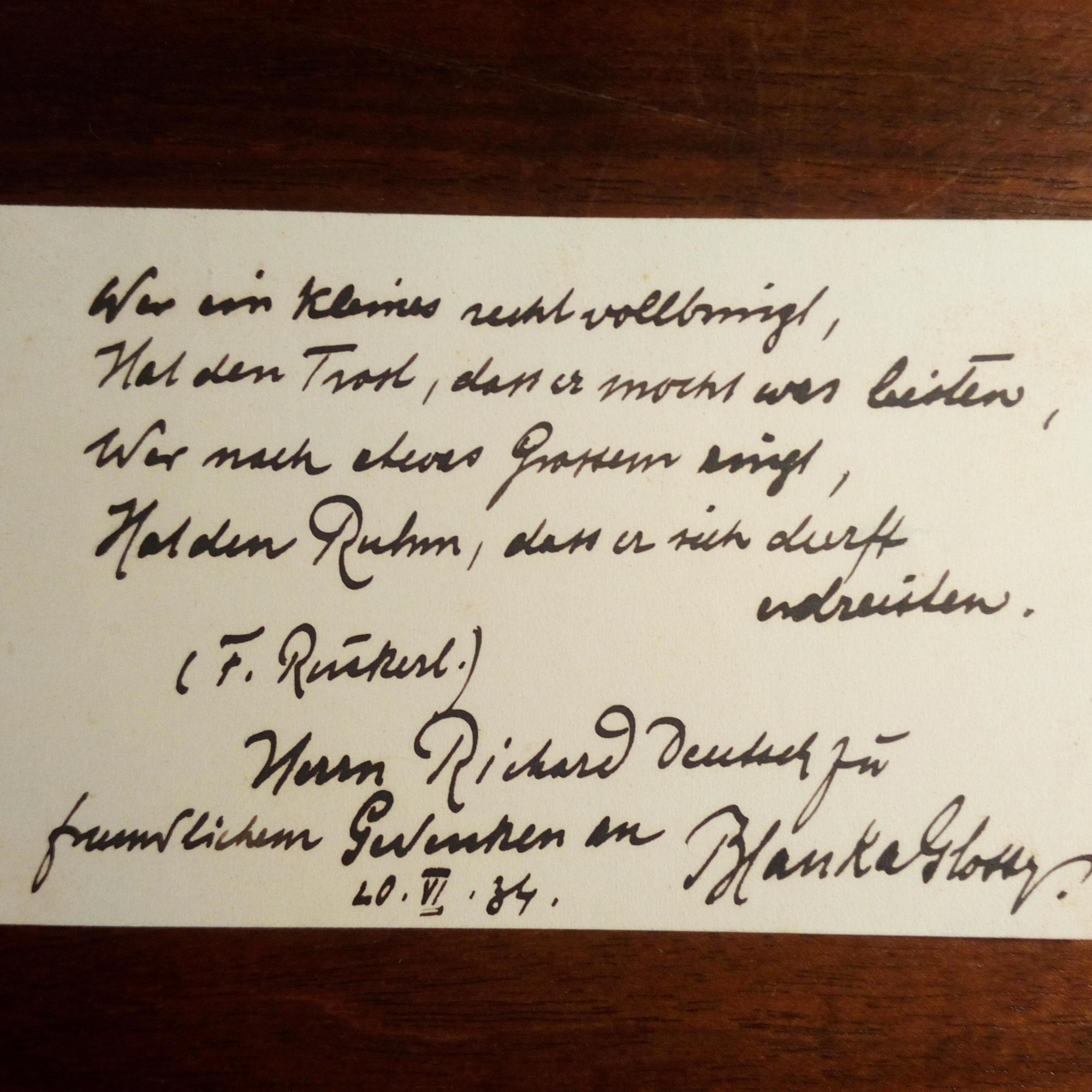1893-1952, Wiener Volksschauspielerin und Disseuse - Kärtchen m. e. Vierzeiler (von F. Rückert), Widm. für den Bühnen-Schriftsteller Richard Deutsch (1876-1913), U. u. D. 20.6.1934.