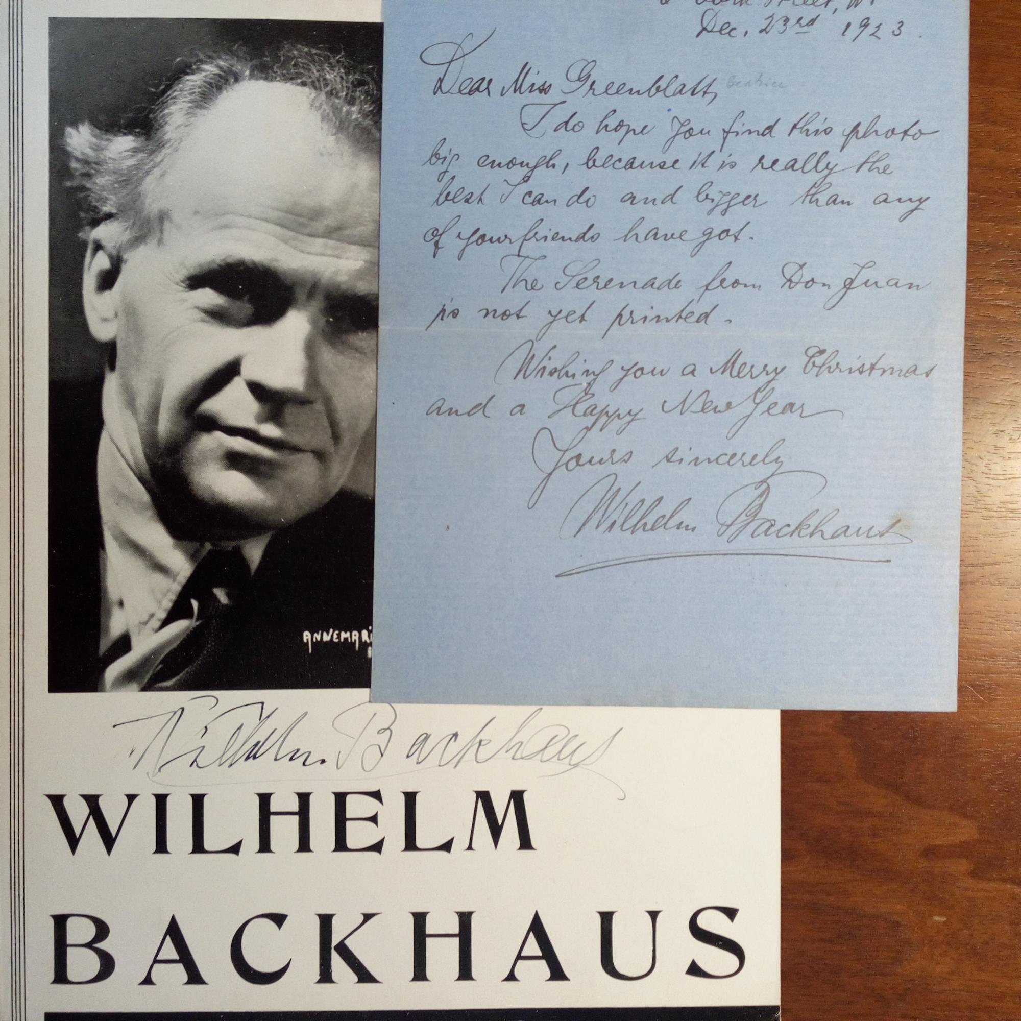 1884-1969, Pianist - E. Brief mit U., London 23.12.1923, 1 S. kl. 4°, blaues Papier, Übersetzung liegt bei.. An "Miss Greenblatt":...I do hope You find this photo big enough...The Serenade from Don Juan is not yet printed... Beiliegen: Pfo. (ger. gedunkelt, kl. Mont.spuren) m. Widm. (für den italien. Schauspieler Luis Pilotti, 1933-80), U. und Jahr 1921, U. unter Titelporträt auf Programm (4°) Paris, 19.5.1939, und Kärtchen m. e. Grüßen, U. u. 25.8. 1937. Dazu Pfo. m. Faks.-U. aus jüngerer Zeit.