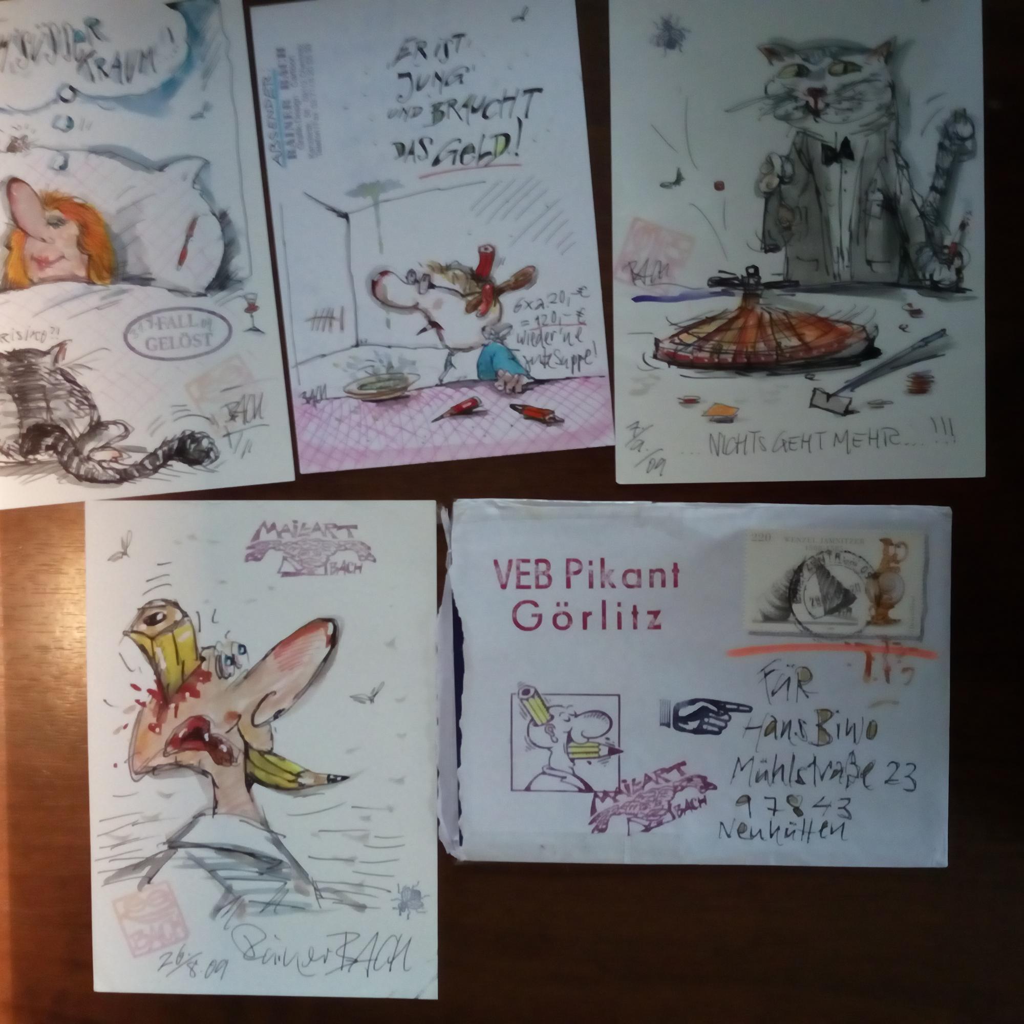1946-2019, Karikaturist - 4 Karten mit e. witzigen Farb-Zeichnungen (Mischtechnik), je als e. postal. Ansichtskarte (Chemnitz 2008/09), mit vielen Stempeln, Verzierungen und Anmerkungen. Beiliegt ähnlicher e. postal. Umschlag (Chemnitz 29.10.2009), darin 4 gedr. Werk-Ansichtskarten (Serie "Die neue Bundesrepublik ist volljährig).