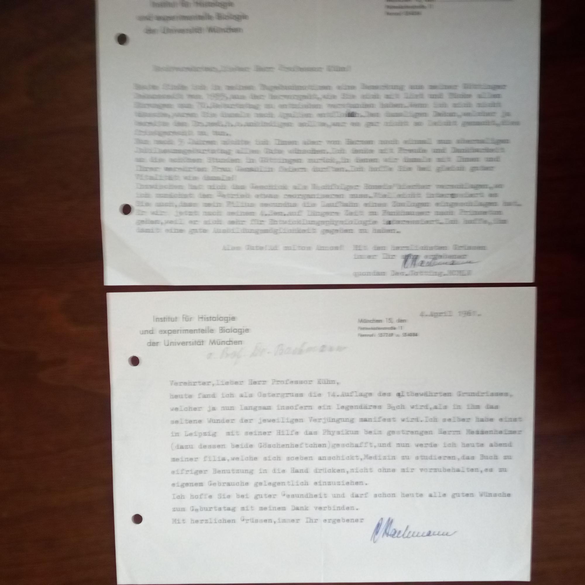 1910-97, Anatom - 2 Briefe mit U., zus. 2 S. 8°quer, dicht geschr., Br.kopf des Instituts für Histologie in München, gel. April 1960 u. April 1961. An den Zoologen Alfred Kühn (1885-1968) in Tübingen: Ausführl. Grüße zum Geb. mit gemeins. Erinnerungen.