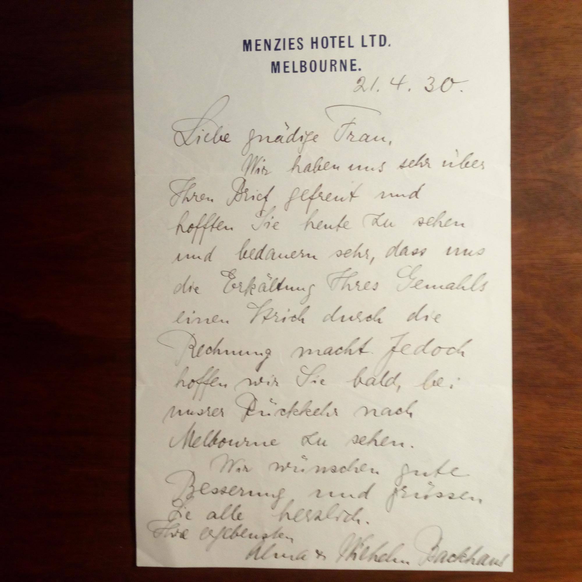 1884-1969, Pianist - Brief (geschr. von seiner Frau, der Harfenistin Alma B.) mit seiner U., Melbourne 21.4.1930, 1 S. 8°, Br.kopf des Hotels. ...hofften Sie heute zu sehen und bedauern sehr, dass uns die Erkältung Ihres Gemahls einen Strich durch die Rechnung macht... Beiliegt Pfo. (aus Programm, Altersspuren) mit U., mit e. postal. Umschlag.