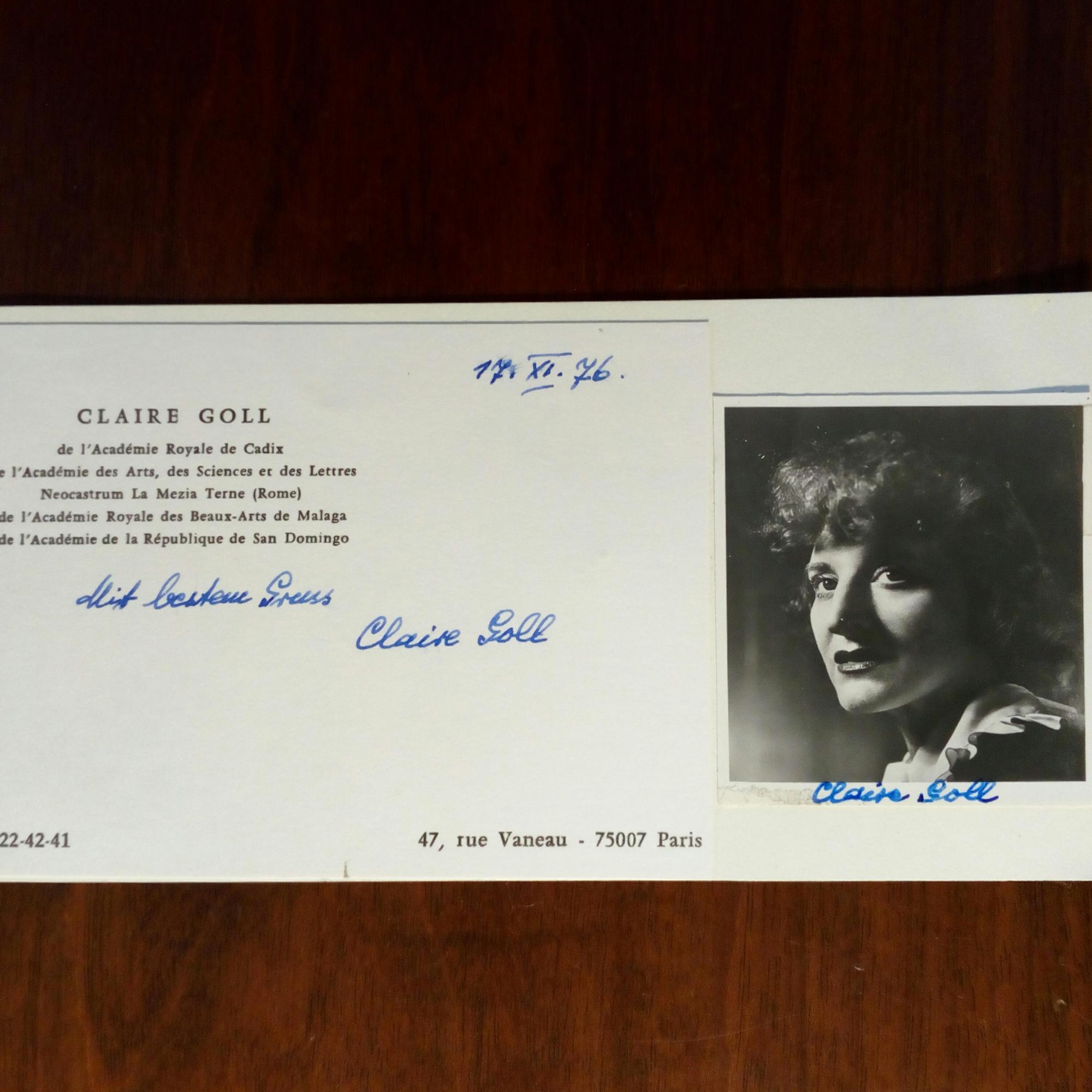 1891-1977, dt.-frz. Schriftstellerin - Ansichtskarte ("La fenêtre du Poète Claire Goll", naive Zeichnung eines Fensters., Sicht auf einen Klostergarten), auf Rücks. mangelhaft mont. Pfo. Daneben Widm. und U., 18.10.1974. Beiliegt Karte mit mont. Ded.blatt mit e. Gruß, U. und D. 17.11.1976. Zus. mit kl. Pfo. (Repro) mit U. mont. auf Karte.