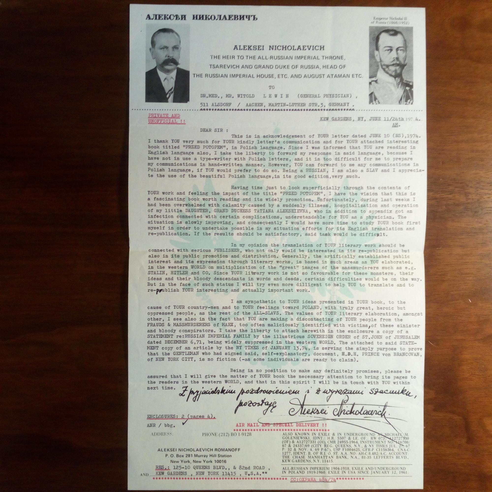 1922-93, poln. Offizier und Spion, seit 50er Jahren Informant des Westens, gab sich seit '71 als der russ. Thronfolger Aleksei Nikolaevich Romanoff aus - Aufwendiger Brief mit ausführl. E. und U., New York 11.6.1974, 1 S. folio, dicht beschr., mit Pfo. von sich und Zar Nikolaus II. am Kopf. "Private and unofficial !". Persönl. Details und geht auf Forschungen des Adr., des Arztes Witold Levin in Aachen ein. ...You are making a discontacting of your people from the Frauds & massmurderers of Marx, too often maliciously identified with victims...