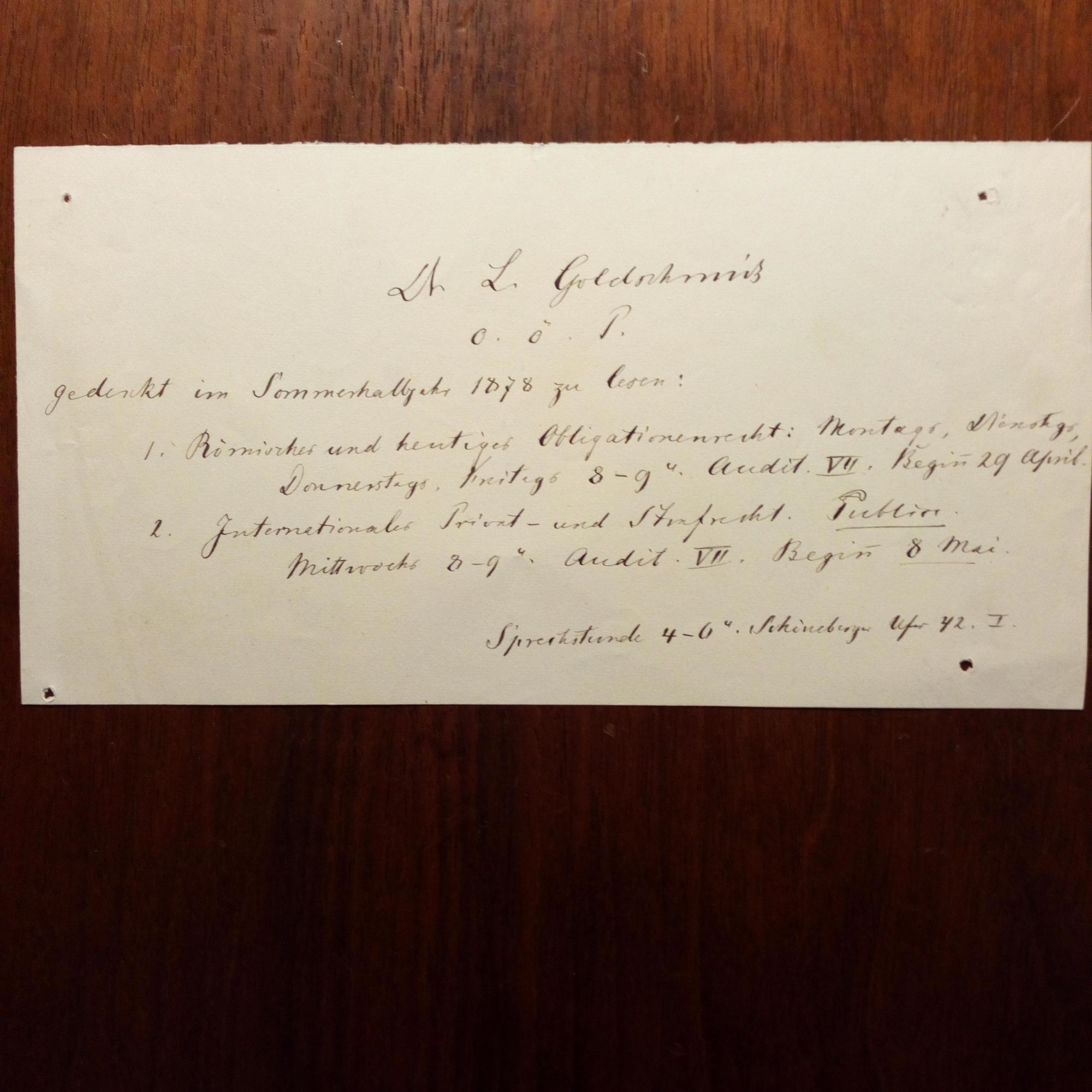 1829-97, Jurist (Handelsrecht) in Berlin - E. Vorlesungs-Ankündigung für das SS 1878, mit U., ca. kl. 8°quer, sauber, mit kl. Nadel-Perforierungen. "Römisches Obligationsrecht" u. "Internationales Strafrecht" und teilt seine Sprechstunden-Zeiten mit.