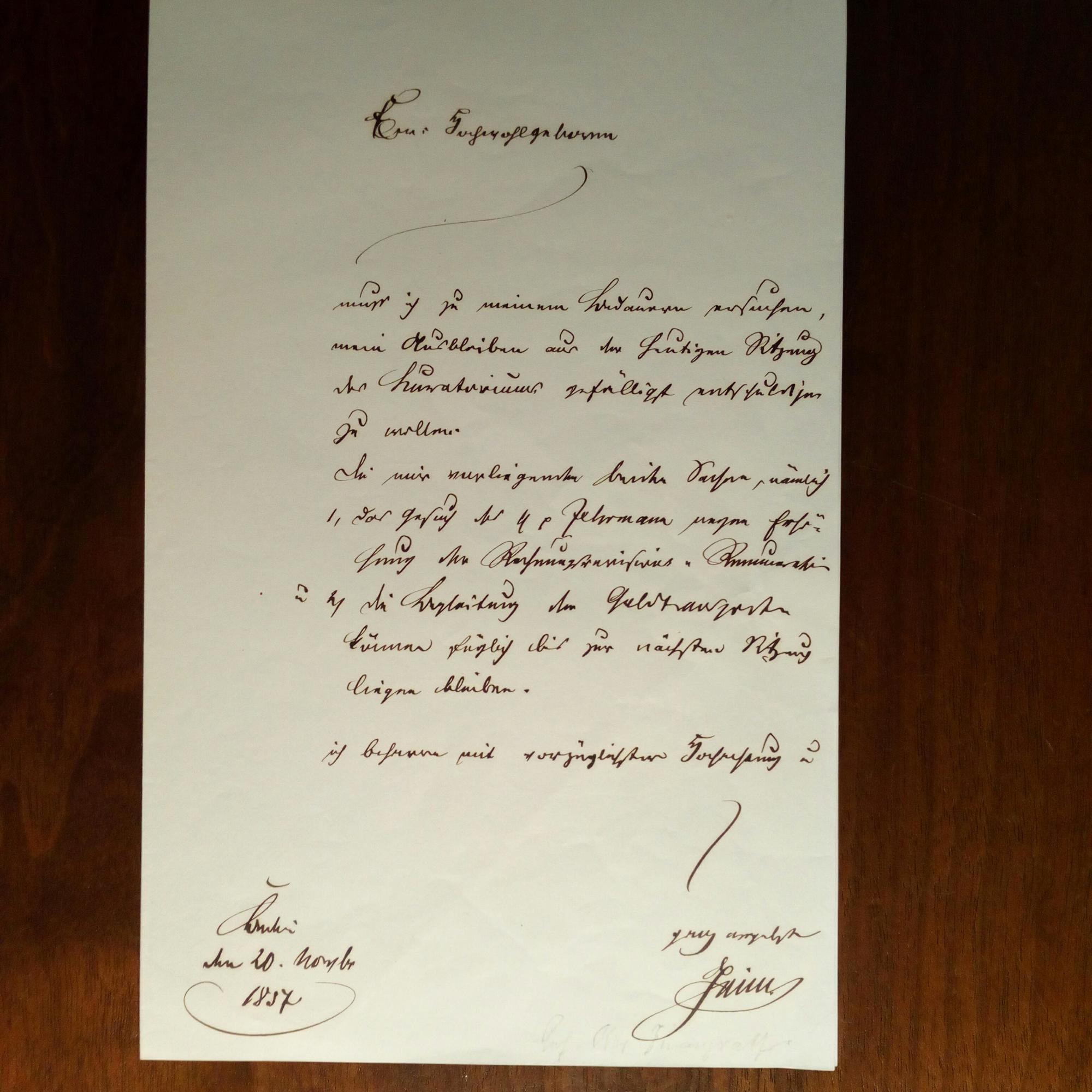1867-1928, "Geheimer Oberfinanzrat im Reichsbank-Direktorium" - E. Brief mit U., Berlin 20.11.1897, 1 S. 8°. An einen Kollegen: Kann leider an der heutigen Sitzung des Konsistoriums nicht teilnehmen. Wegen Gesuches des Herrn Fehrmann und: ...Die Begleitungen der Geldtransporte können täglich bis zur nächsten Sitzung liegen bleiben...