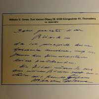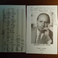 1902-80, Komponist - 2 e. Briefe mit U., Berlin Juni/Juli 1974, zus. knapp 5 S. 4°, Abs.stempel. Mit 1 e. postal. Umschlag. Inh.reich über gepl. Sendungen seiner Werke im Hess. Rundfunk. Beiliegen: 4°-Blatt mit gedr. Pfo., darauf e. Zitat, Widm. und U., und beschn. Notenblatt mit e. Partitur (4 Takte) "Prélude für Klavier, op.162" mit U.