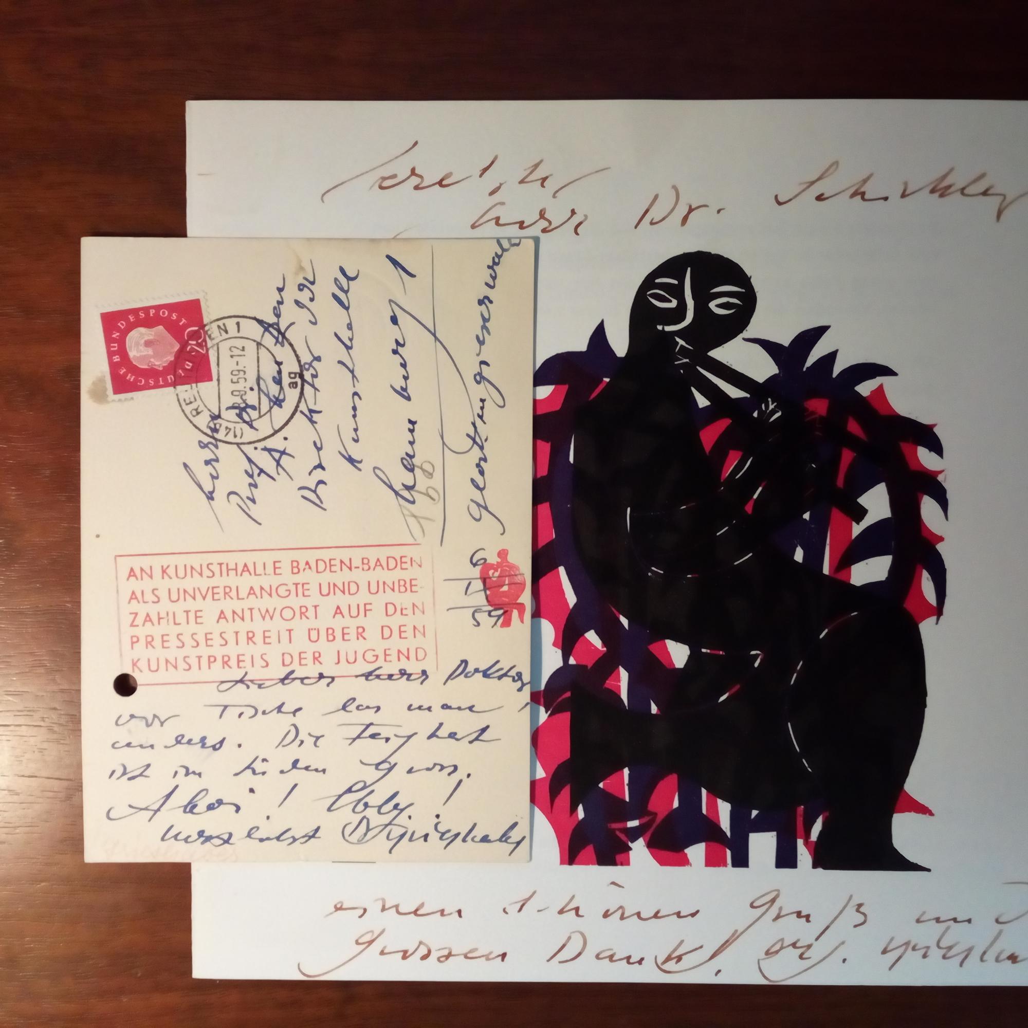 1909-81, Graphiker - E. postal. Werk-Ansichtskarte, etw. fleckig, mit U., gel., mit e. postal. Umschlag (Reutlingen 8.9.1959). Mit Stempel "An Kunsthalle Baden-Baden als un-verlangte und unbezahlte Antwort auf den Pressestreit über den Kunstpreis der Jugend". An den Dir. der Hamburger Kunsthalle, Alfred Henzen (1903-85): ...vor Tische las man manches. Die Feigheit ist im Süden gern... Beiliegt: Einladung zur Ausstellung "Farbholzschnitte" (Frankfurt 1975), Doppelblatt, kl. 4°. Auf Vorders. Widm. (für Dr. Schickler) mit U.