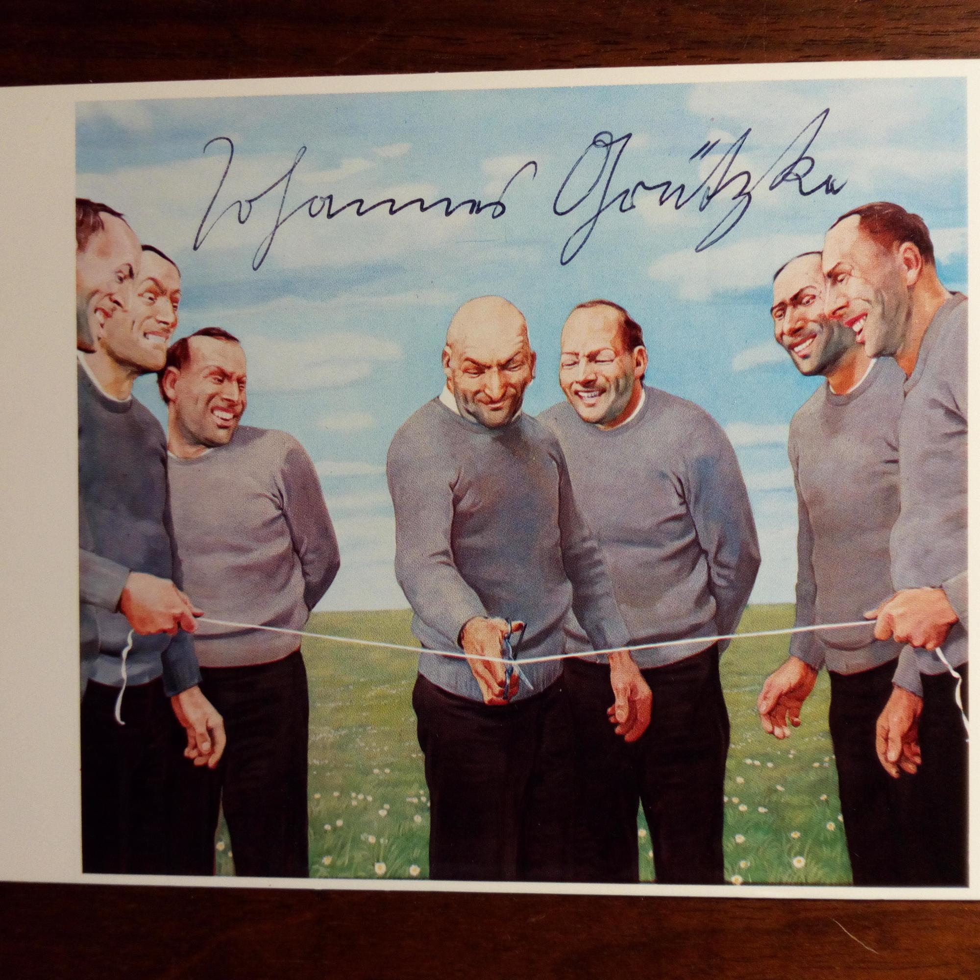 1937-2017, Maler und Zeichner - Werk-Ansichtskarte (sein Gemälde "Festakt im Freien", 1969) mit U. Beiliegen: Karte mit mont. kl. Druck seines Selbstbildnisses von 1995) mit U. und D. 1.6.2007, Bleistift, als postal. Postkarte (ger. Eckknick) und kl. Presseartikel.