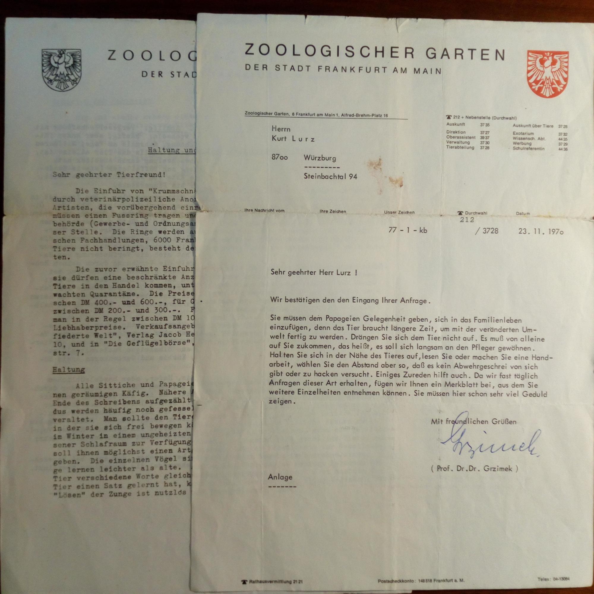 1909-87, Zoologe u. Fernseh-Moderator - Br. m. U., (Frankfurt) 23.11.1970, 1 S. 4°, Br.kopf des Frankfurter Zoos, dessen Leiter er war, kl. Gebr.spuren. Ausführl. betr. der Pflege eines Papageis: ...Drängen Sie sich dem Tier nicht auf. Es muß von alleine auf Sie zukommen ... Da wir täglich Anfragen dieser Art bekommen, fügen wir Ihnen ein Merkblatt bei... Dieses (m. Br.kopf des Zoos) liegt bei. Dazu Pfo. (zus. m. einem jungen Wolf bei seiner Fernsehsendung "Ein Platz für Tiere") m. U.