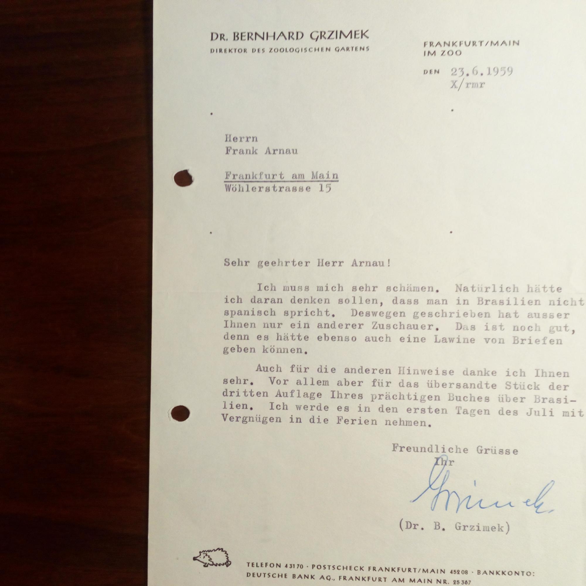 1909-87, Zoologe - Br. mit U., (Frankfurter Zoo 23.6.1959), 1 S. 8°, Br.kopf. Dankt dem Schriftsteller Frank Arnau (1894-1976) in Frankfurt für versch. Hinweise betr. einer Folge seiner Fernseh-Sendung "Ein Platz für Tiere": ...hätte ich daran denken sollen, dass man in Brasilien nicht spanisch spricht. Deswegen geschrieben hat ausser ihnen nur ein anderer Zuschauer... Beiliegt Pfo. (zu der Sendung, zus. m. jungem Wolf) mit U.