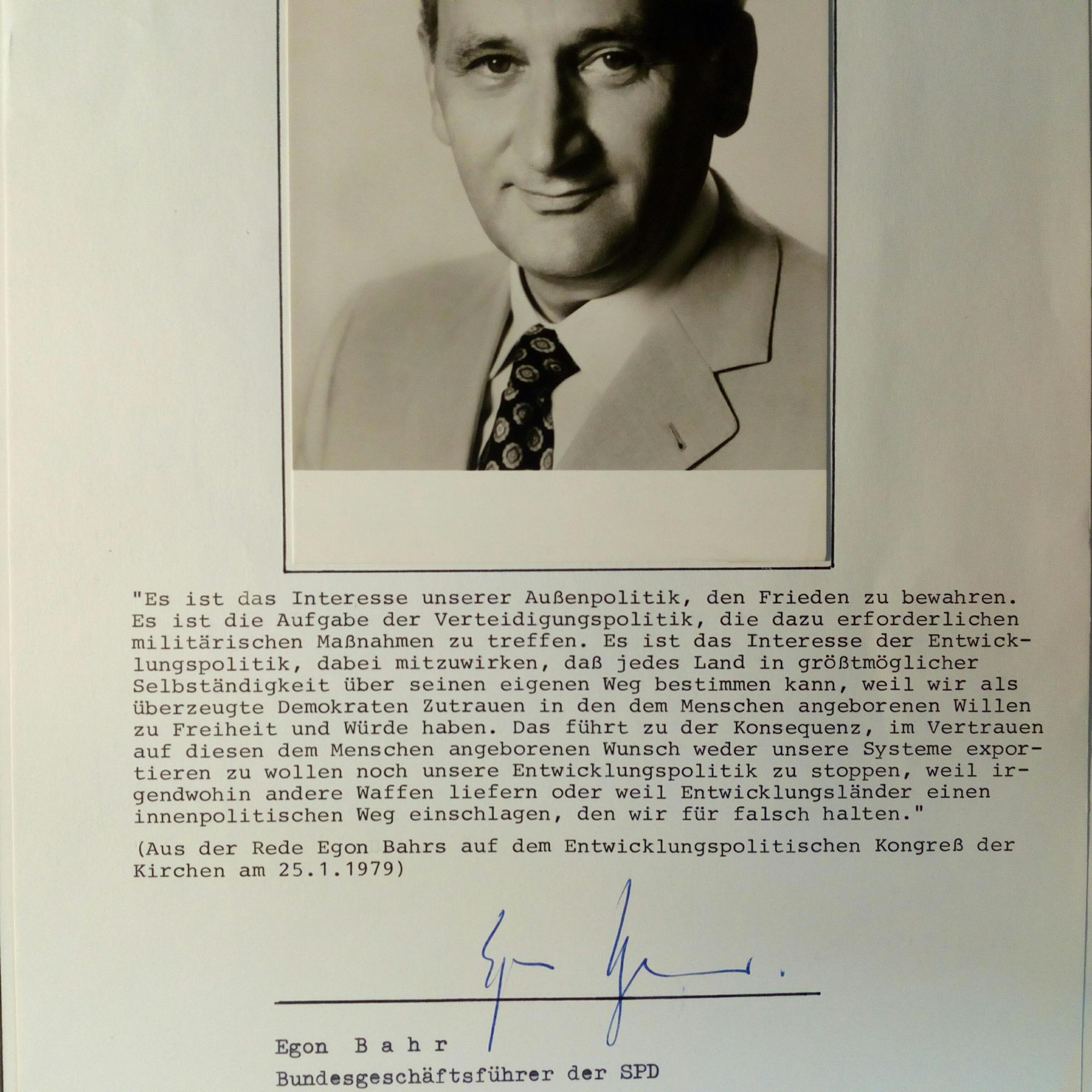 1922-2015, SPD-Außenpolitiker und Diplomat - Längeres Zitat (Typoskript, "Aus der Rede auf dem Entwicklungspolitischen Kongreß der Kirchen am 25.1.1979") u. U. unter auf 4° mont. Pfo.