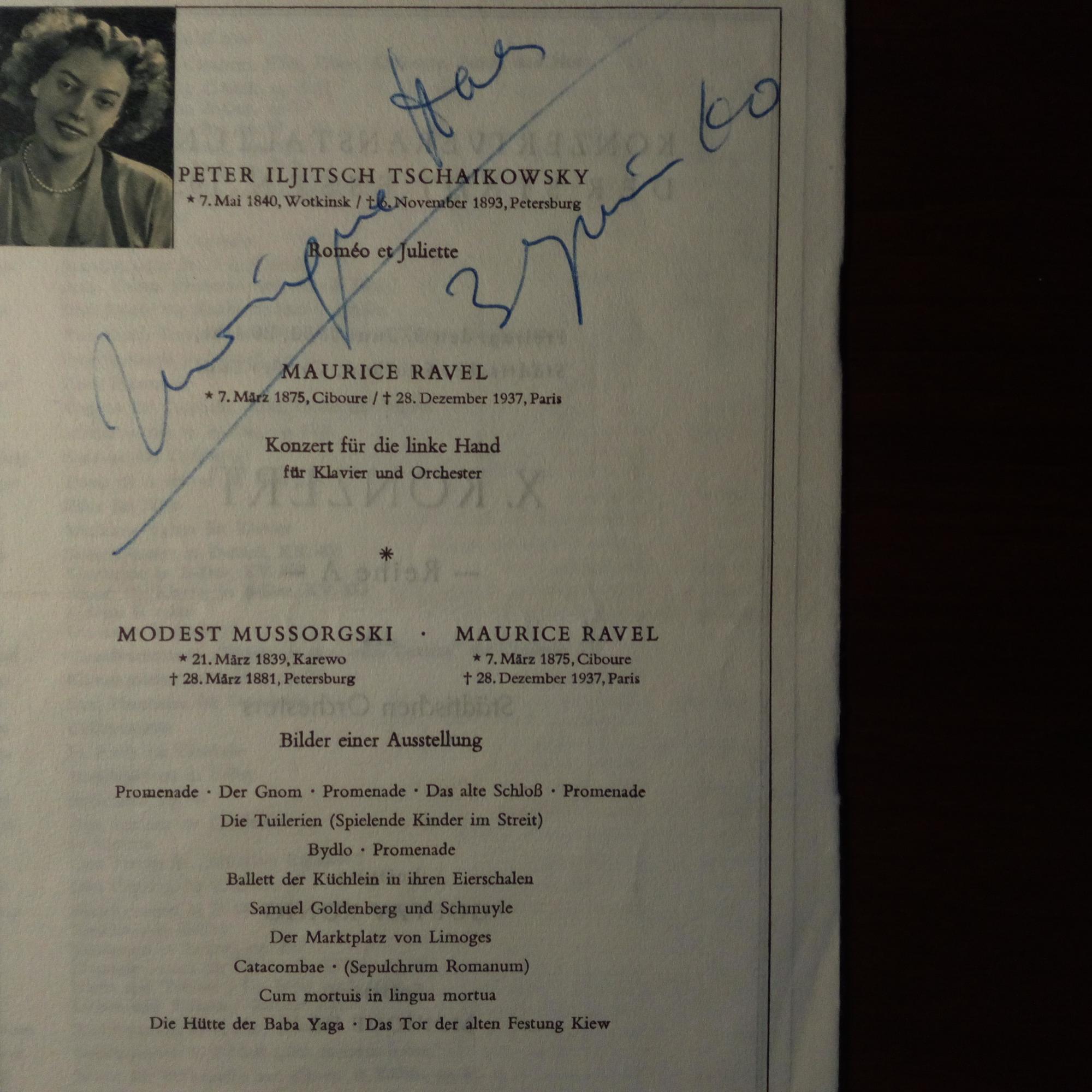 1909-87, frz. Pianistin - Programm-Faltblatt (gr. 8°) eines Konzerts des Städt. Orchesters Essen am 3.6.1960 mit U. und D. bei darauf mont. kl. Druck-Pfo.