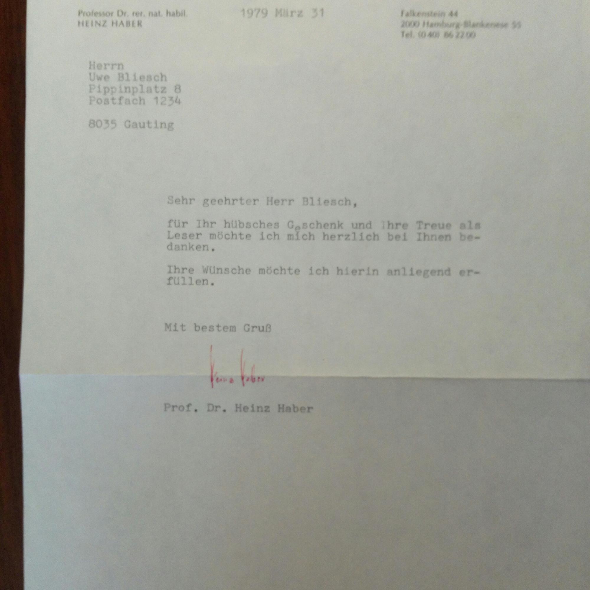 1913-90, Physiker, Astronom und populärwiss. Publizist - Brief mit U., Falkenstein bei Hamburg (Br.kopf) 31.3.1979.. Beiliegt sein Buch "Lebendiges Weltall" von 1968.