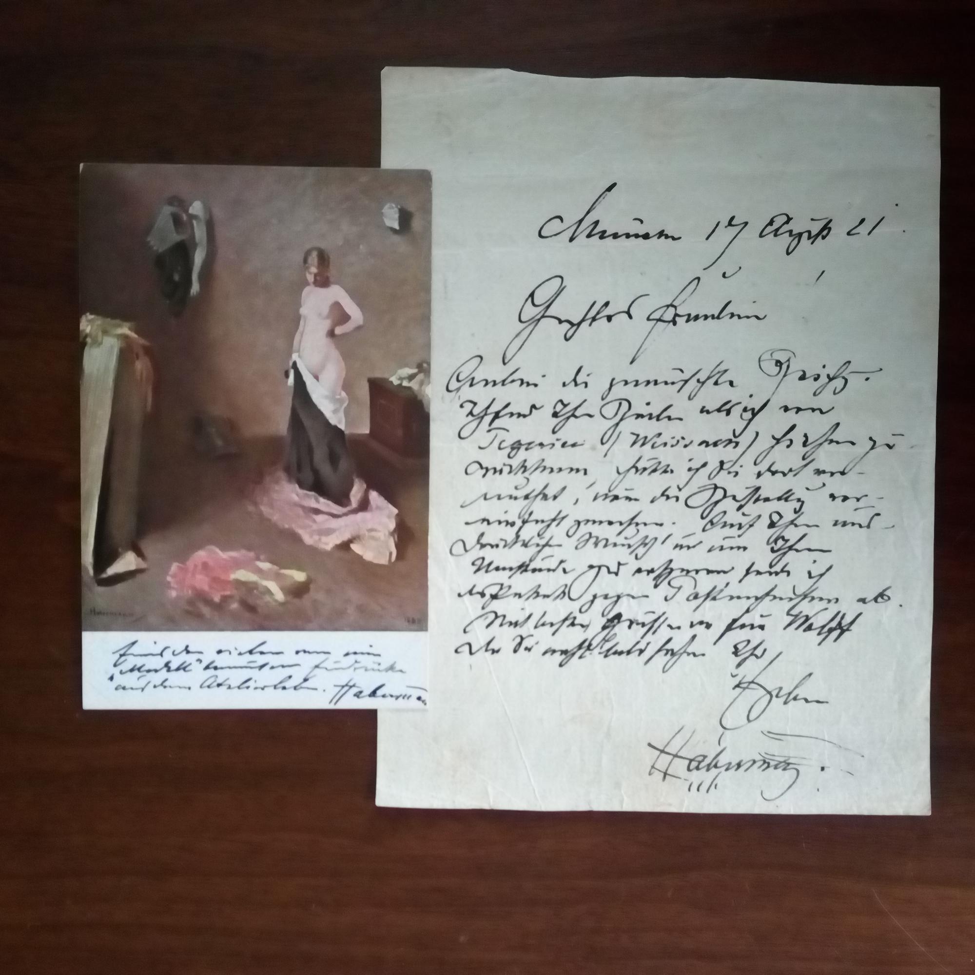 1849-1929, Maler, Präsident der Münchner Sezession - E. Br. m. U., München 17.8.1921, 1 S. 8°, Altersspuren. An ein Fräulein, das etwas bei ihm bestellt hatte. ...als ich vom Tegernsee (Weissach) zurückkam, hätte ich Sie dort vermutet... Beiliegt Kunst-Ansichtskarte ("Jugend"-Karte nach einem seiner Bilder) m. e. Zusatz u. U. auf Bildseite: "Eines der vielen von mir 'Modell' benannten Eindrücke aus dem Atelierleben".