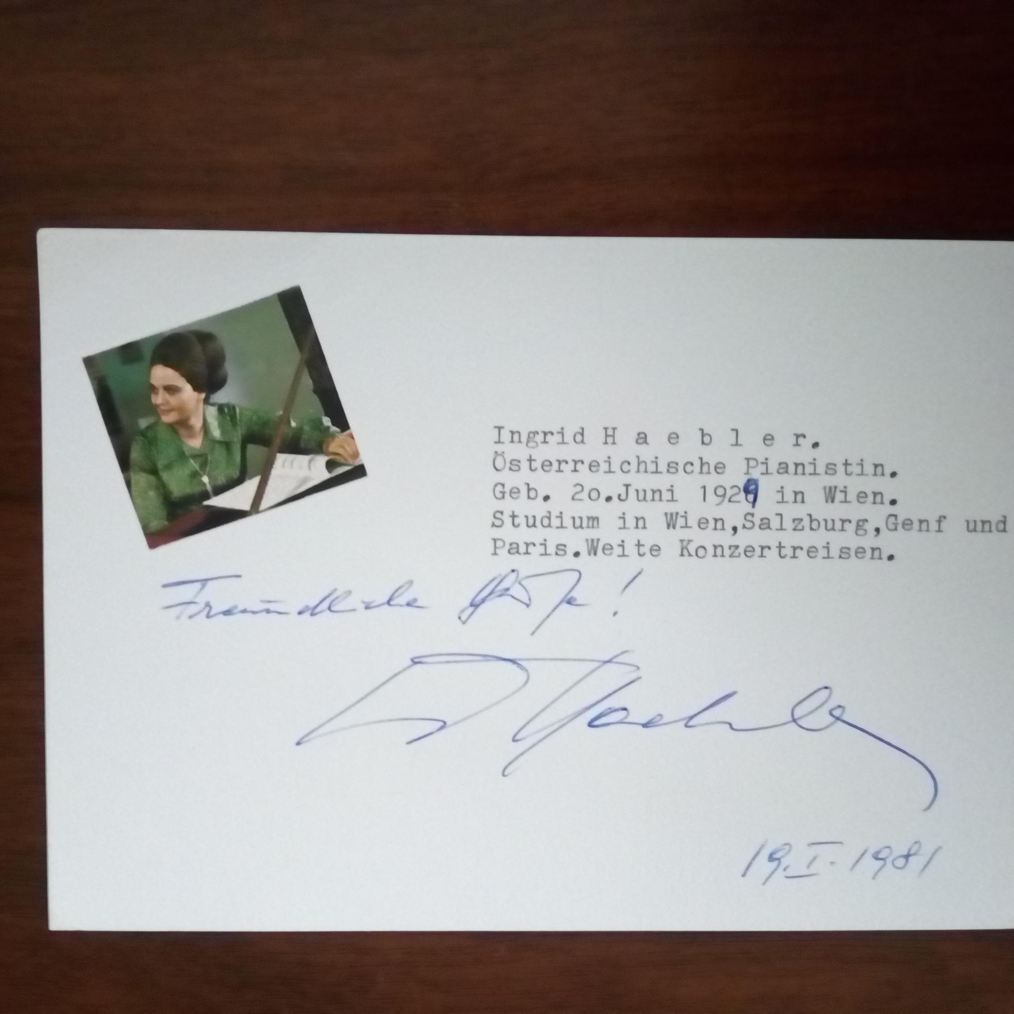 1929-2023, österr. Pianistin - Karte mit kl. mont. Druck-Pfo., kl. Erläuterung, U. und D. 19.1.1981.