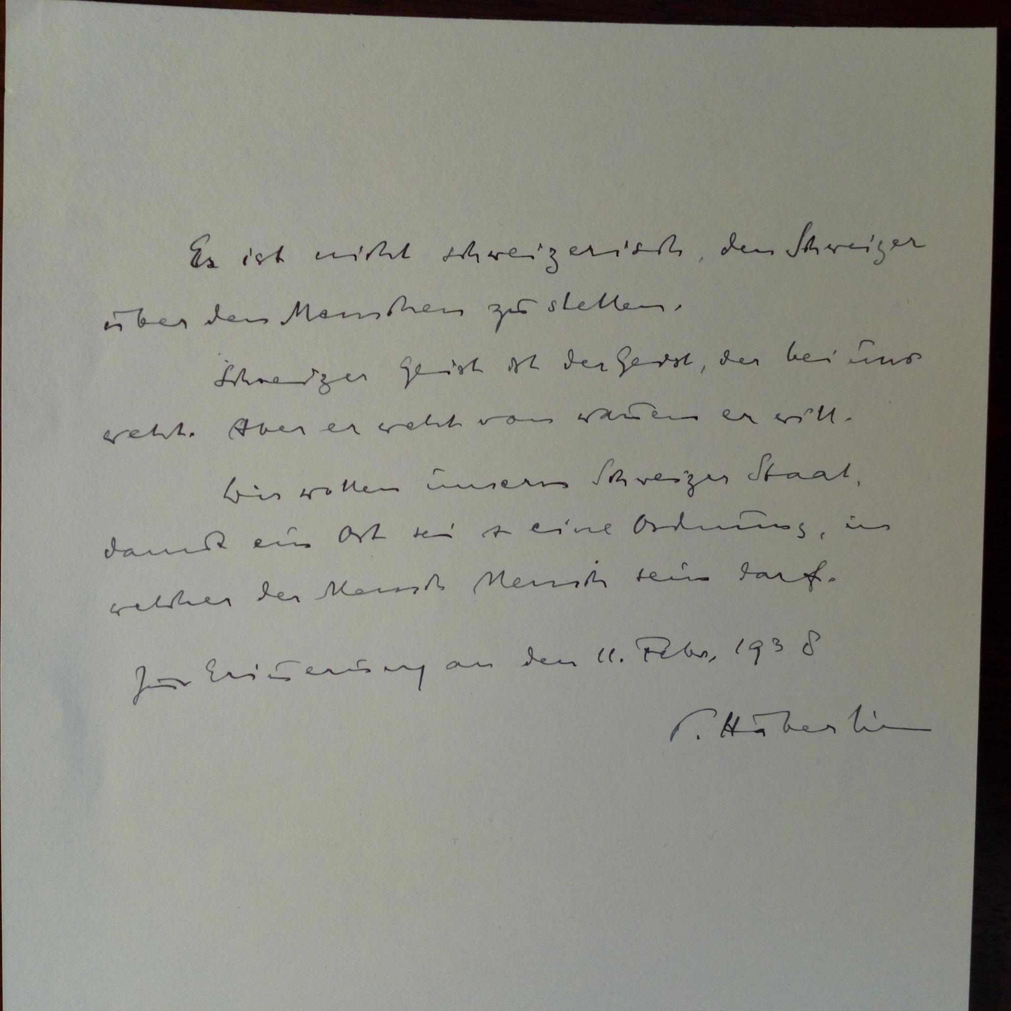 1878-1960, schweiz. Philosoph - 3 e. Aphorismen (zum Thema "Schweiz") mit U., 11.2.1938, ca. ½ S. 4°.