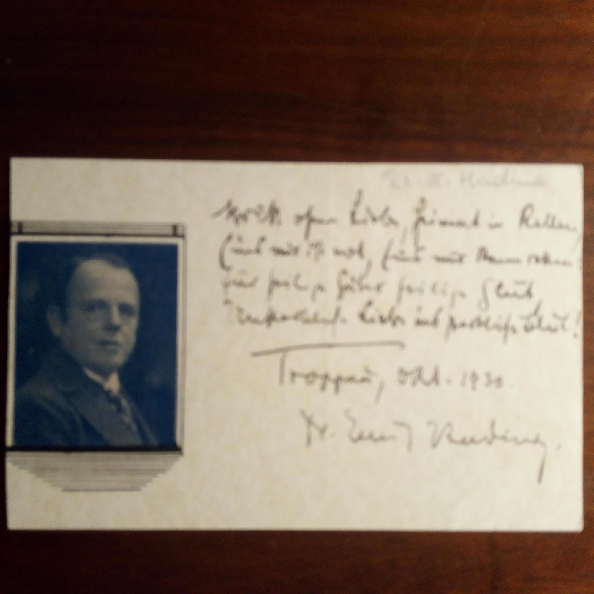 1885-1957, schles. Schriftsteller - handverzierte Karte m. mont. kl. Druck-Pfo., e. Gedicht (4 Z.), U., O. u. D. Troppau Okt. 1930. Beiliegt kl. Blatt m. e. Sinnspruch u. U.