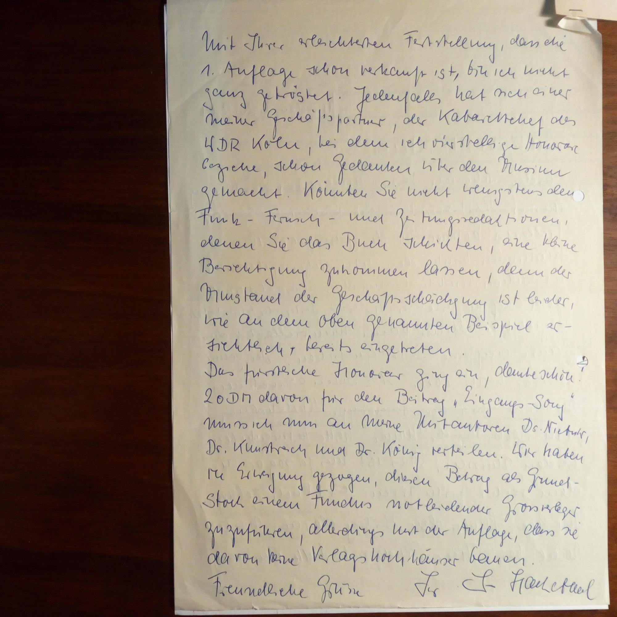 1924-2003, Kabarettist und Schauspieler - E. Br. m. U., München 29.12.1964, 2 S. 4°, Br.kopf. An eine Redaktion m. Details zur Veröffentlichung seines Artikels "Am 326. Tag der Mauer". Dieser ist als Typoskript angeheftet.