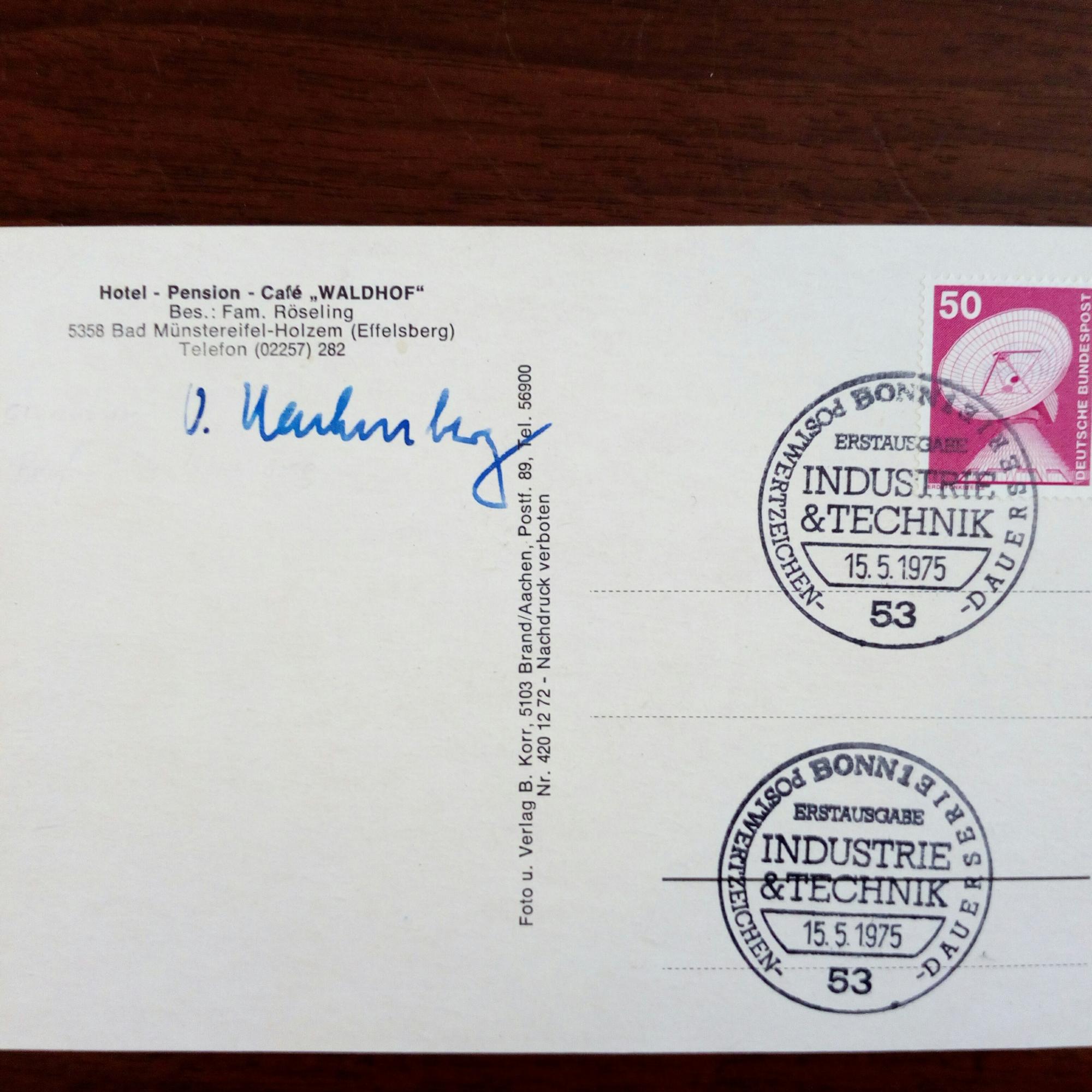 1911-2001, Astro-Physiker - Ansichtskarte des Hotels "Waldhof" in Bad Münstereifel m. U. auf Textseite. Hier auch Erst-tagsstempel "Industrie und Technik" 15.5.1975.