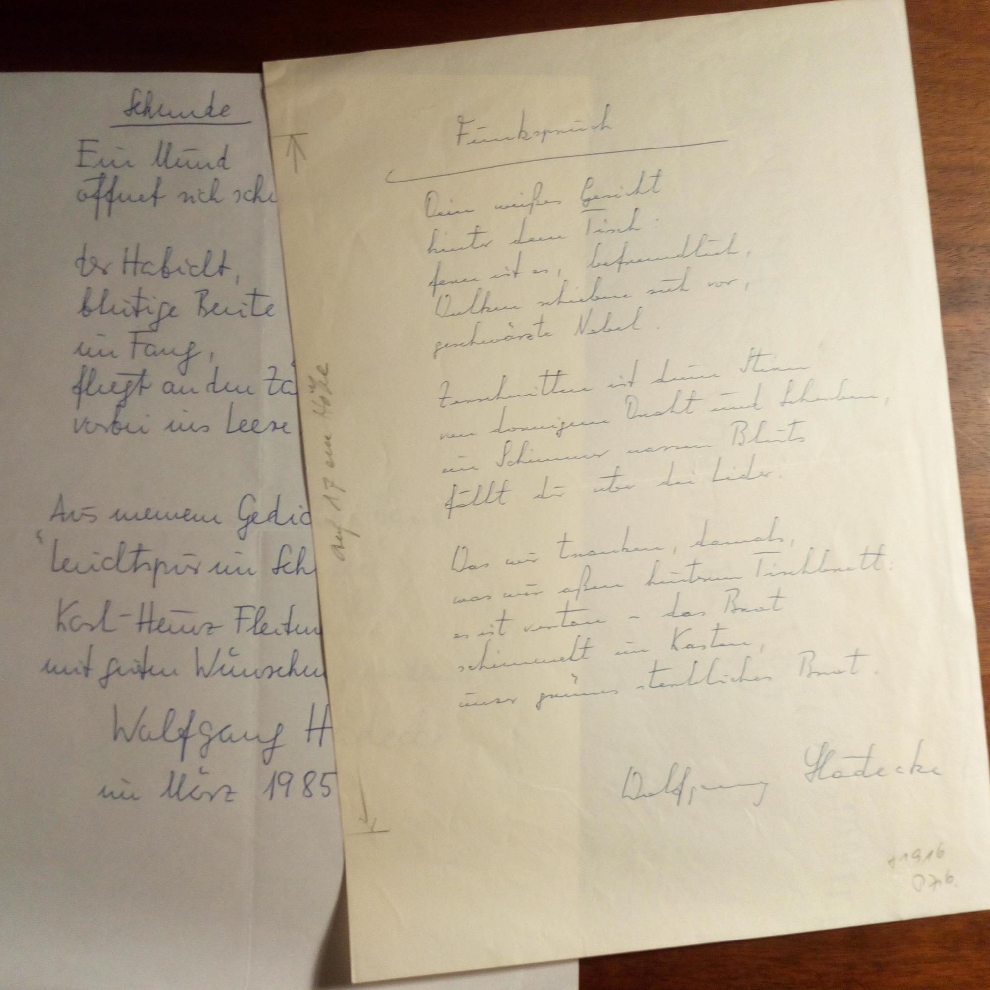 1929-2022, Schriftsteller - E. Gedicht ("Funk-spruch", 14 Z.) mit U., 1 S. 4°, ger. Gebr.spuren, Druck-Notizen. Dazu 4°-Seite mit e. Gedicht ("Sekunde", 7 Z., aus "Leuchtspur im Schnee"), Widm. und U., März 1985. Mit e. postal. Umschl. (U. im Abs.).