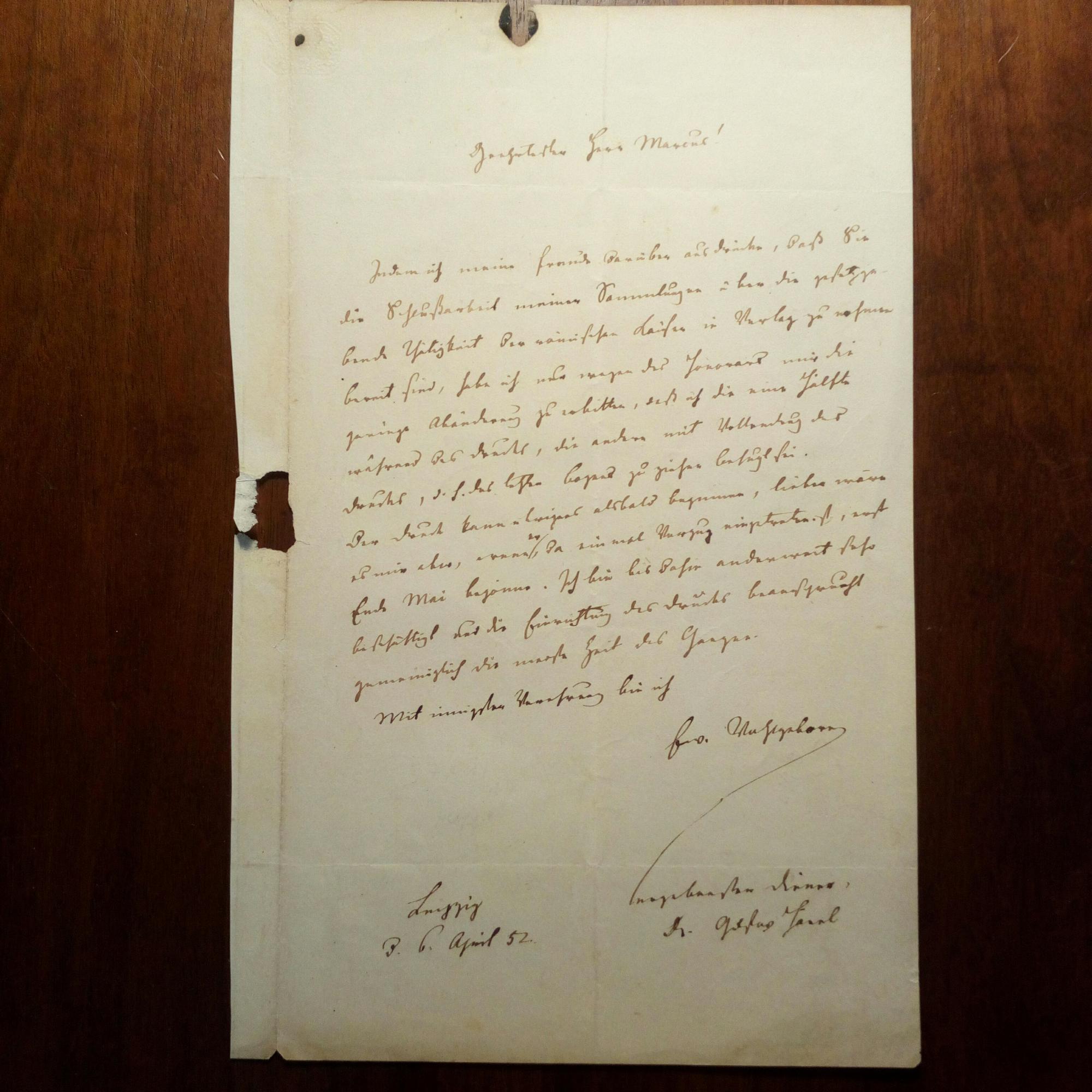 1792-1878, Rechtshistoriker - E. Brief mit U., Leipzig 6.4.1852, 1 S. 8°, ger. Gebr.spuren (u.a. kl. Brandflecken). An den Verleger "Herrn Marcus". Freut sich, "daß Sie die Schlussarbeit meiner Sammlungen über die gesetzgebende Thätigkeit...in Verlag zu nehmen bereit sind...". Wegen aktueller Arbeiten könne er aber erst Ende Mai beginnen.