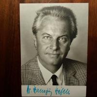 1933-2017, Schriftsteller und Publizist - 4°-Blatt mit privatem Briefkopf. Darauf e. Gedicht ("Zwischen den Altern", 4 Z.) mit Widm. und U., (Möhrfelden) 22.10.1986. Beiliegt eine Karte mit mont. kl .Druck-Pfo., U. und D. 1991.
