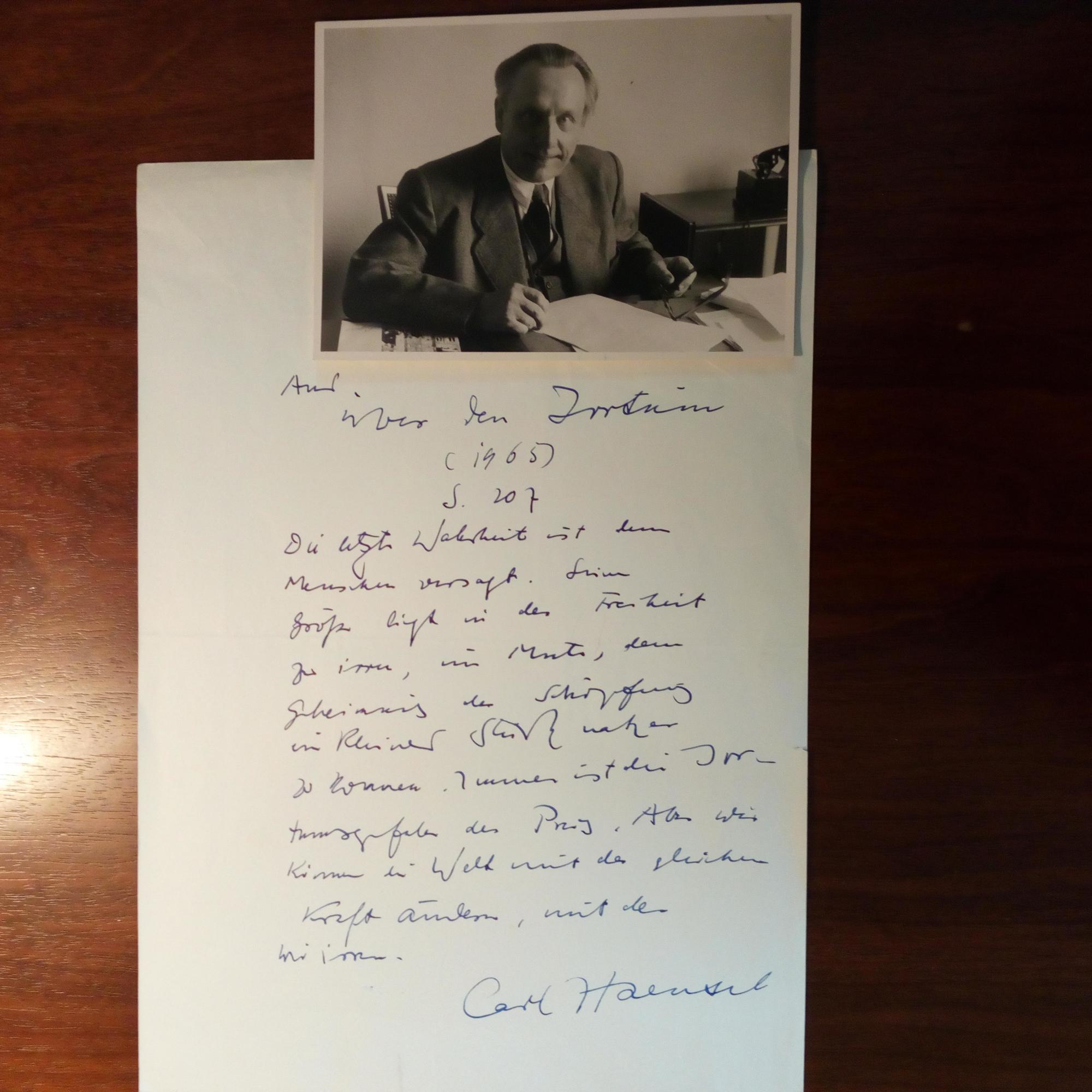 1889-1968, Schriftsteller - 4°-Blatt mit e. langem Zitat und U., Randeinriss. Aus "Über den Irrtum" (1965): ...Die letzte Wahrheit ist dem Menschen versagt... Beiliegt privates Pfo. mit U. auf Rückseite.